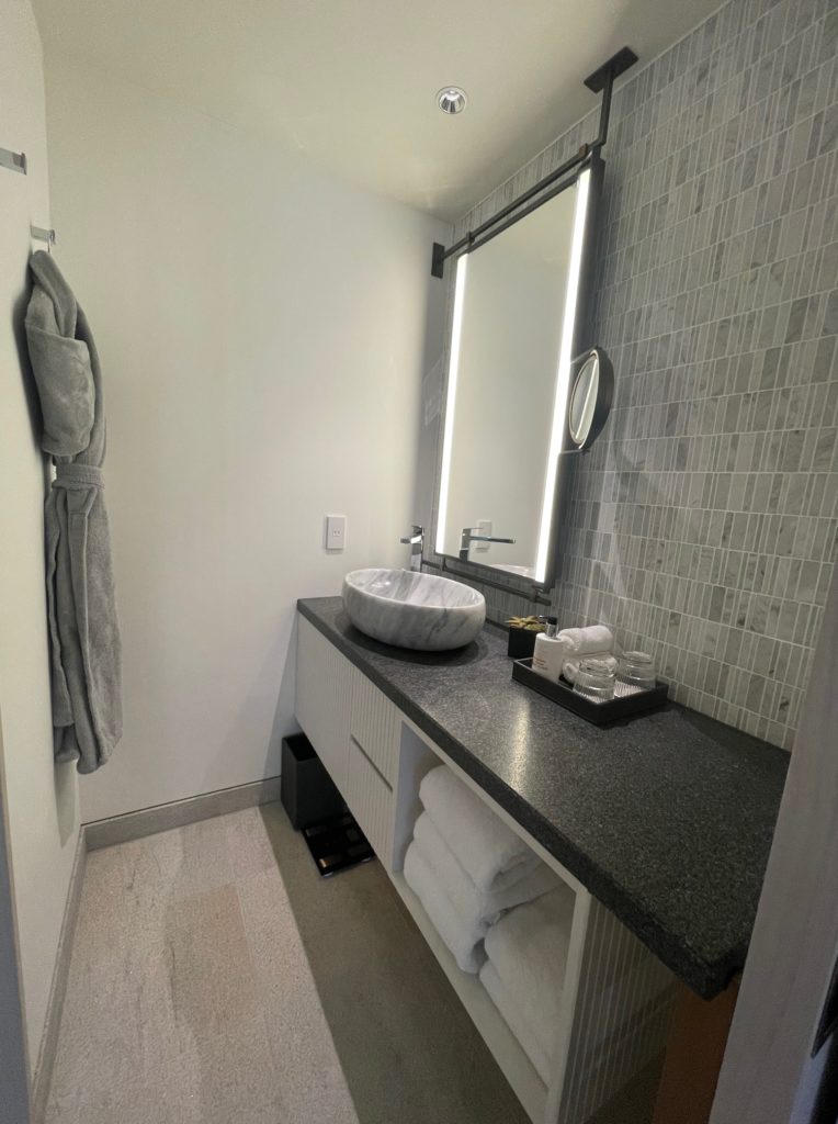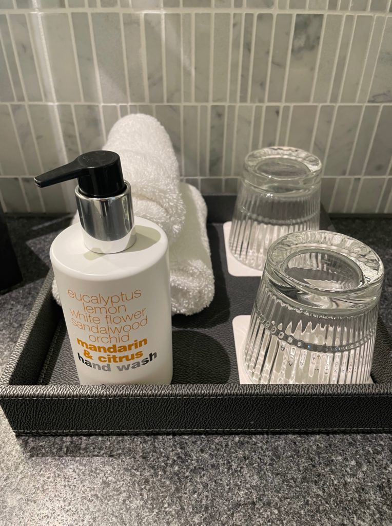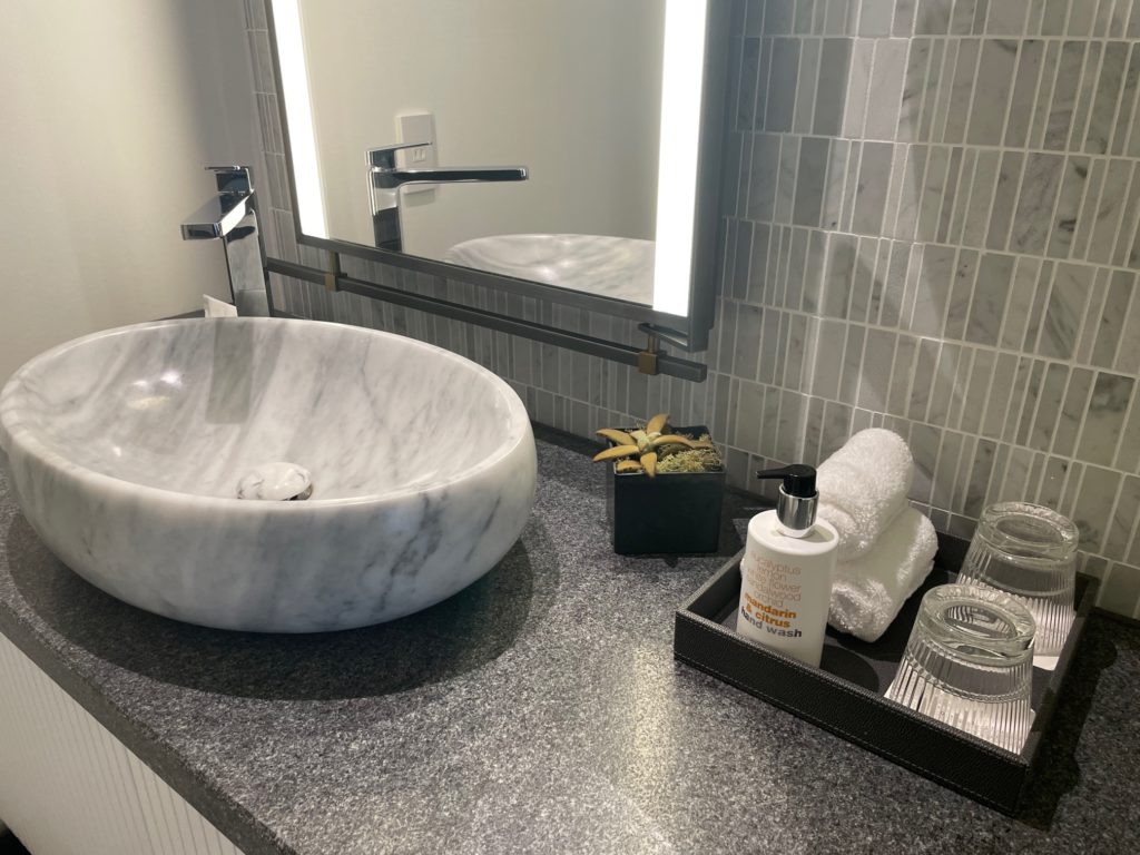 壁のタイルがオシャレですし、洗面ボウルも大理石風でいい感じです。本当にホテルというより新築マンションというイメージです。