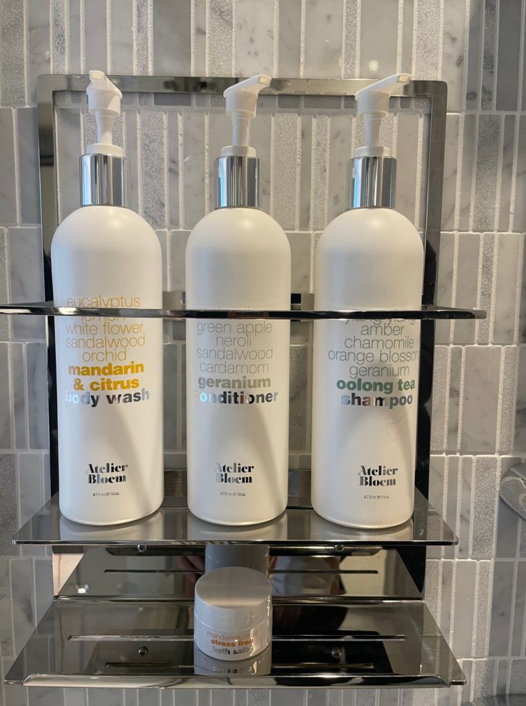 シャンプーがウーロンティー、コンディショナーがゼラニウム、ボディウォッシュと下段のバスソルトがマンダリン&シトラスでした。