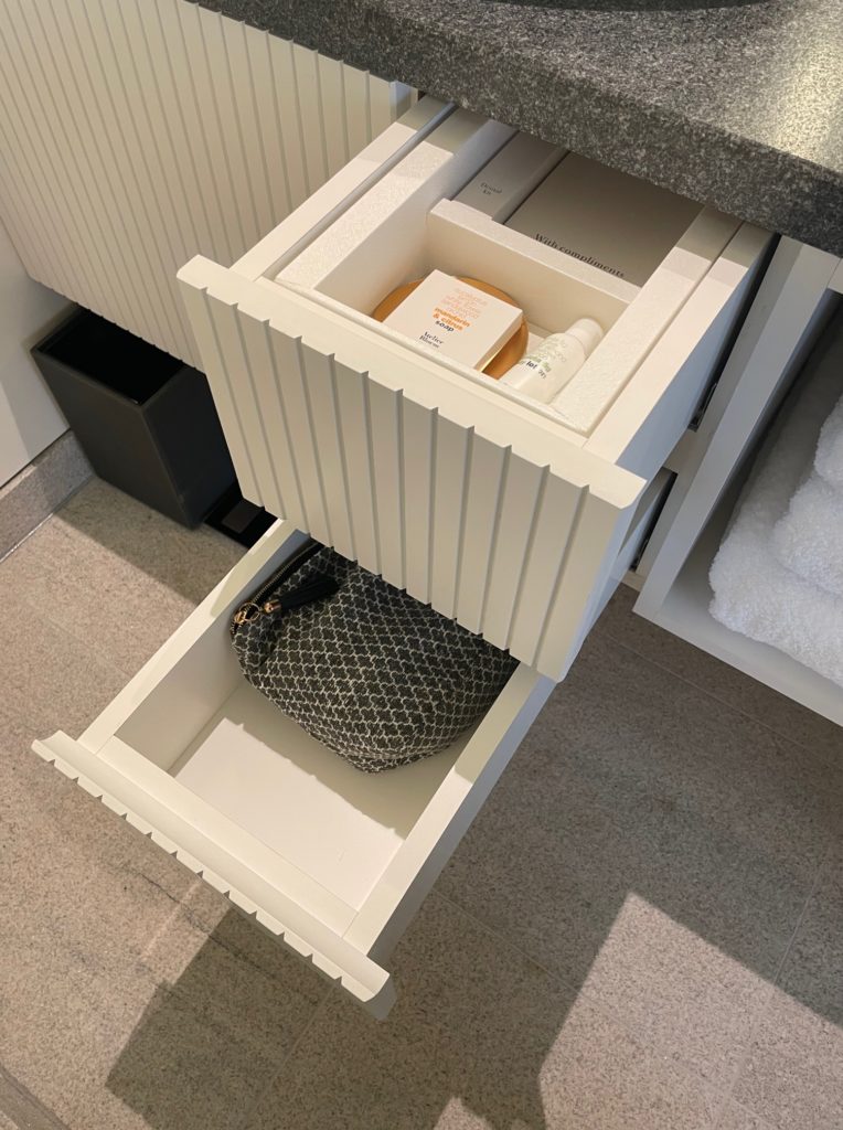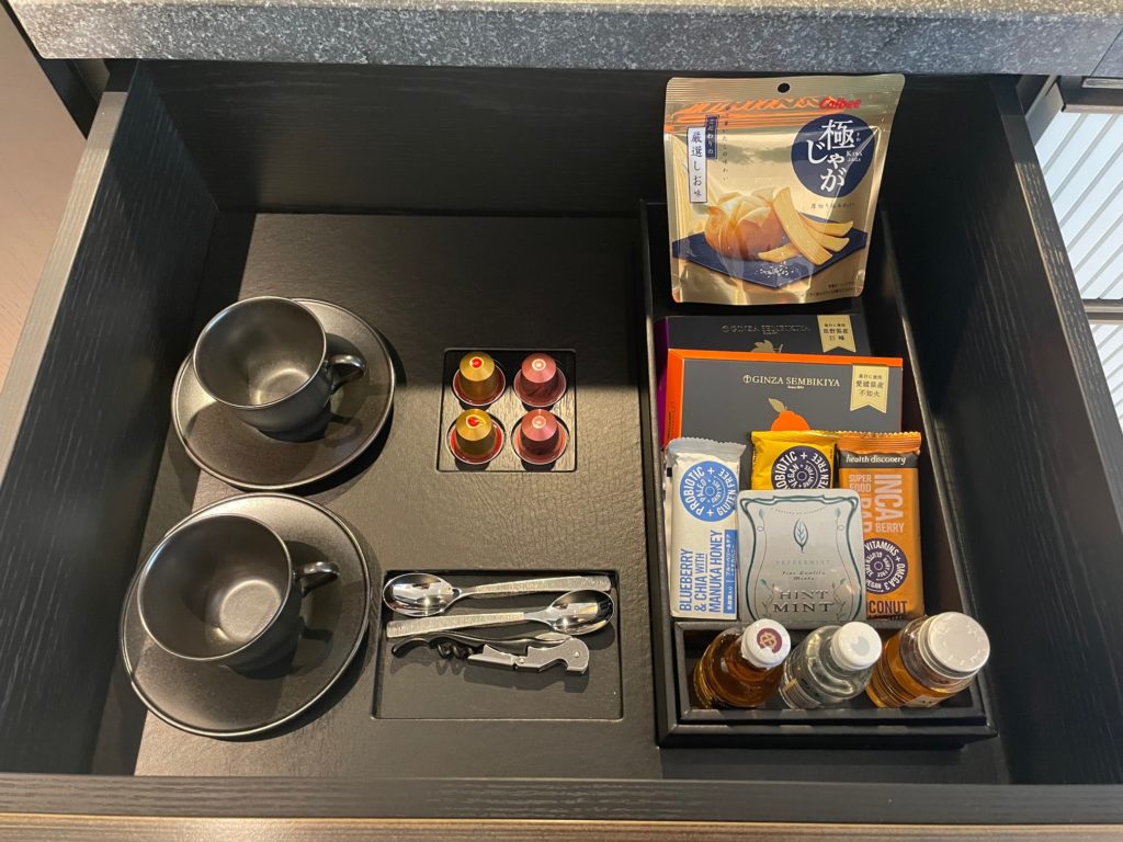 引き出し上段にはカップ&ソーサ、栓抜き、カトラリー、ネスプレッソカプセル、ミニバーのスナックなどが入っています