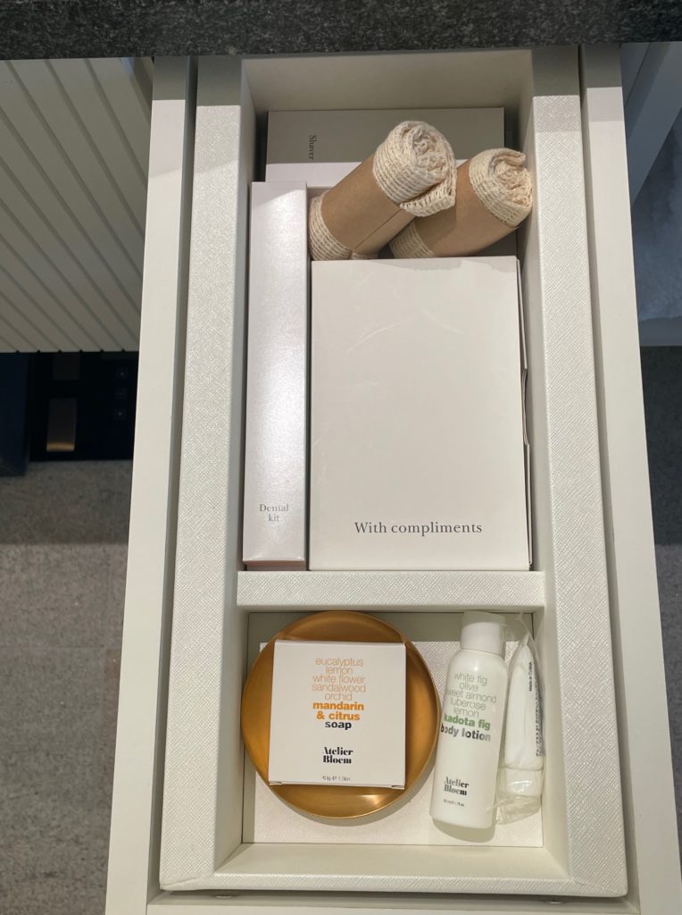 上段は歯ブラシ、カミソリなどのアメニティ、アトリエブルームの石鹸やボディローションなどが入っています