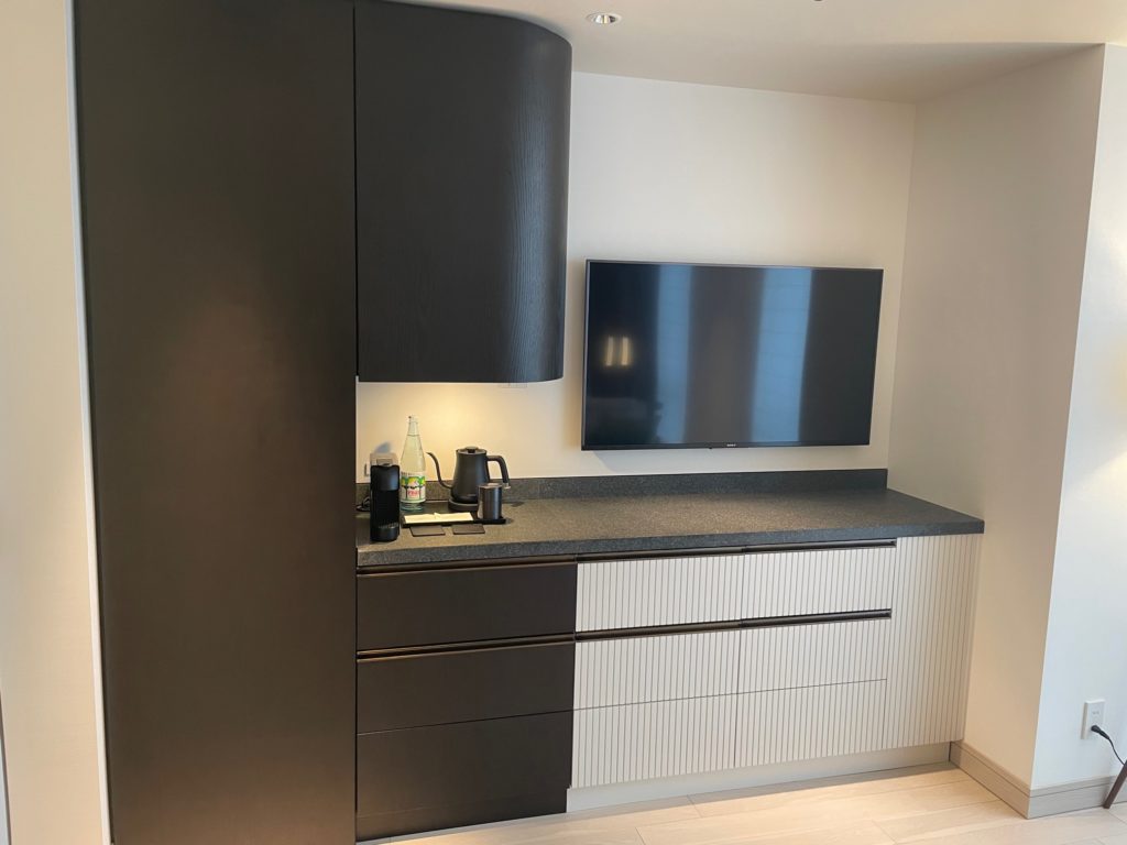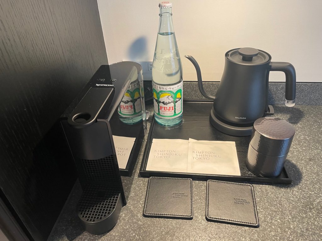 カウンターにはネスプレッソ、電気ケトル、ミネラルウォーター、お茶など