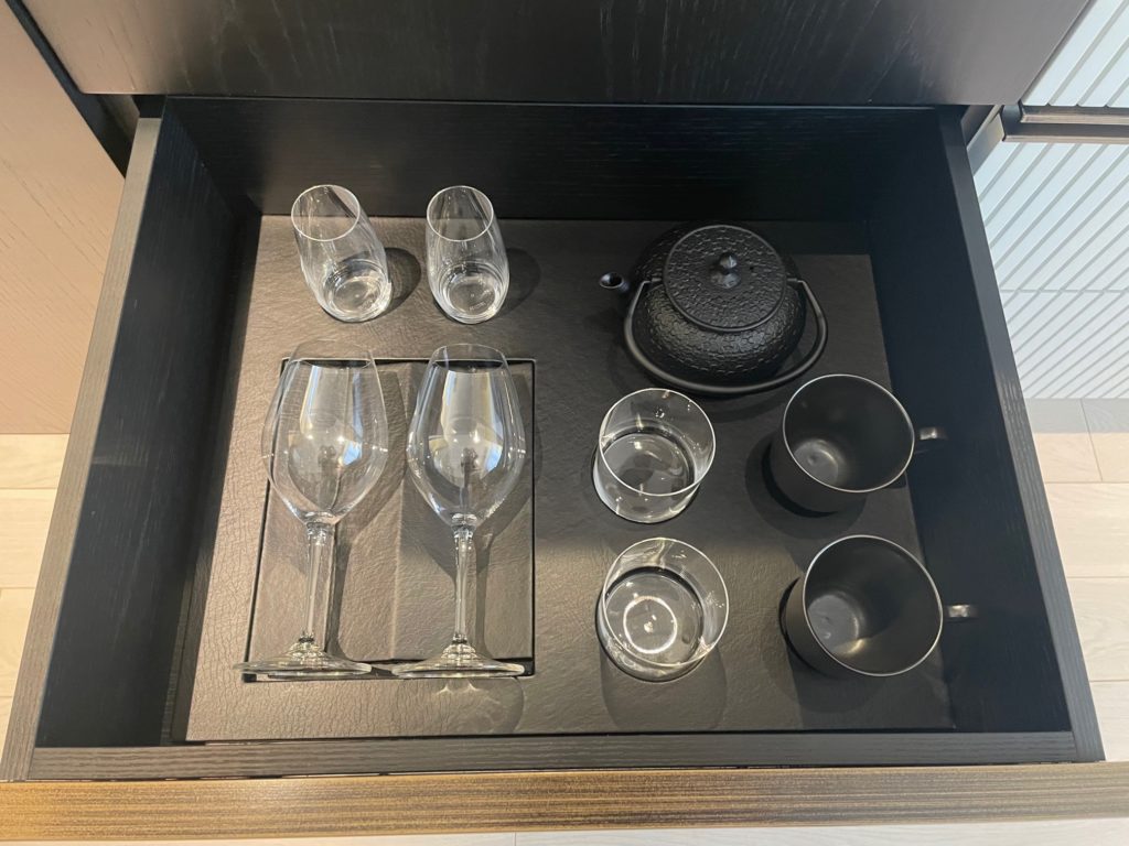 引き出し下段にはワイングラス、グラス、マグカップ、急須などが置かれています