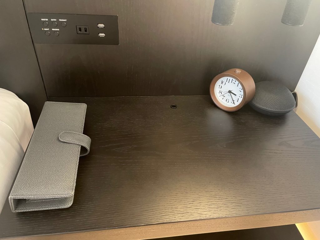 反対側の枕元にはコンセント1口、USBコンセント2口、照明のスイッチ、時計、Bluetoothスピーカーが置かれています