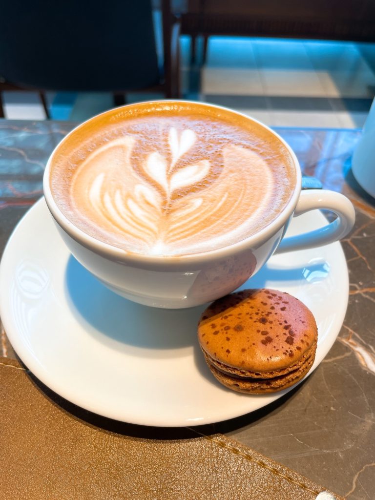 カフェラテを頂きましたが、ピエールエルメのマカロンがついていました