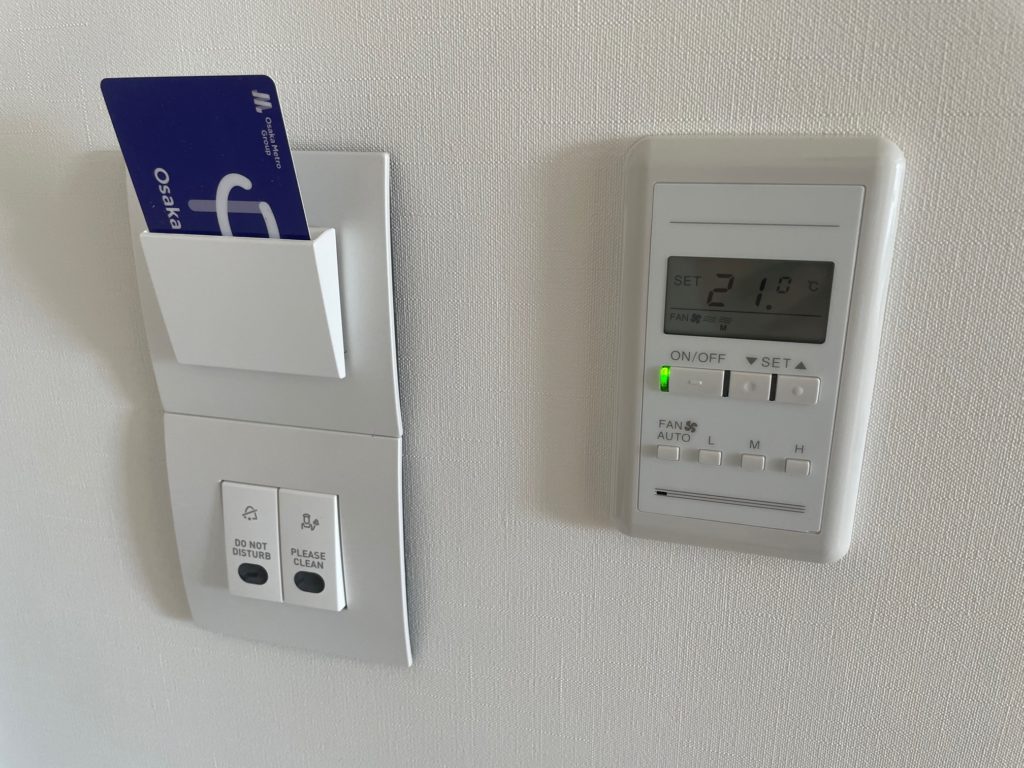 入り口にはエアコンのコントローラー、ビジネスホテルのようにカードの抜き差しによりメイン電源をオンオフするタイプの部屋です