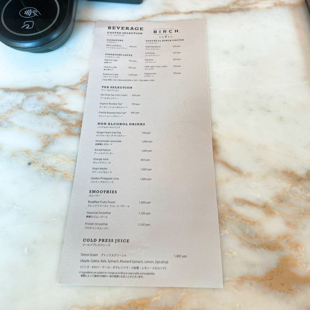 飲み物のメニューは以下のような感じです。BIRCH Coffeeや紅茶、スムージーやコールドプレスジュースもあります。ほうじ茶ラテやバターナッツラテが有名なのですかね?