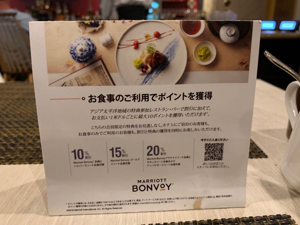 平会員、シルバー会員は10%、ゴールド会員は15%、プラチナ会員以上は20%割引になるというものです。マリオット会員のレストラン割引については以下の記事をご参照下さい