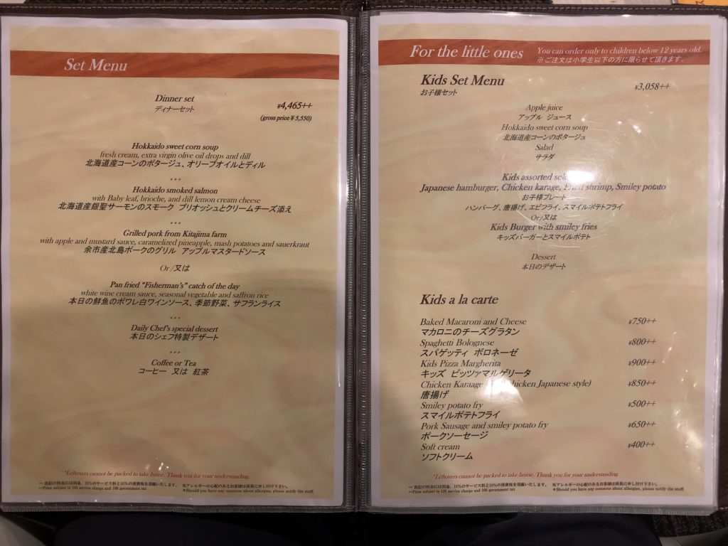 ディナーセット(税サ込5500円)やお子様セット(税サ抜き3058円)もあります。から揚げ、ソーセージ、ピザ、グラタン、パスタなど子供用アラカルトメニューがあるのも子連れにはありがたいです。お子様セットの内容は後ほど写真でご紹介します。