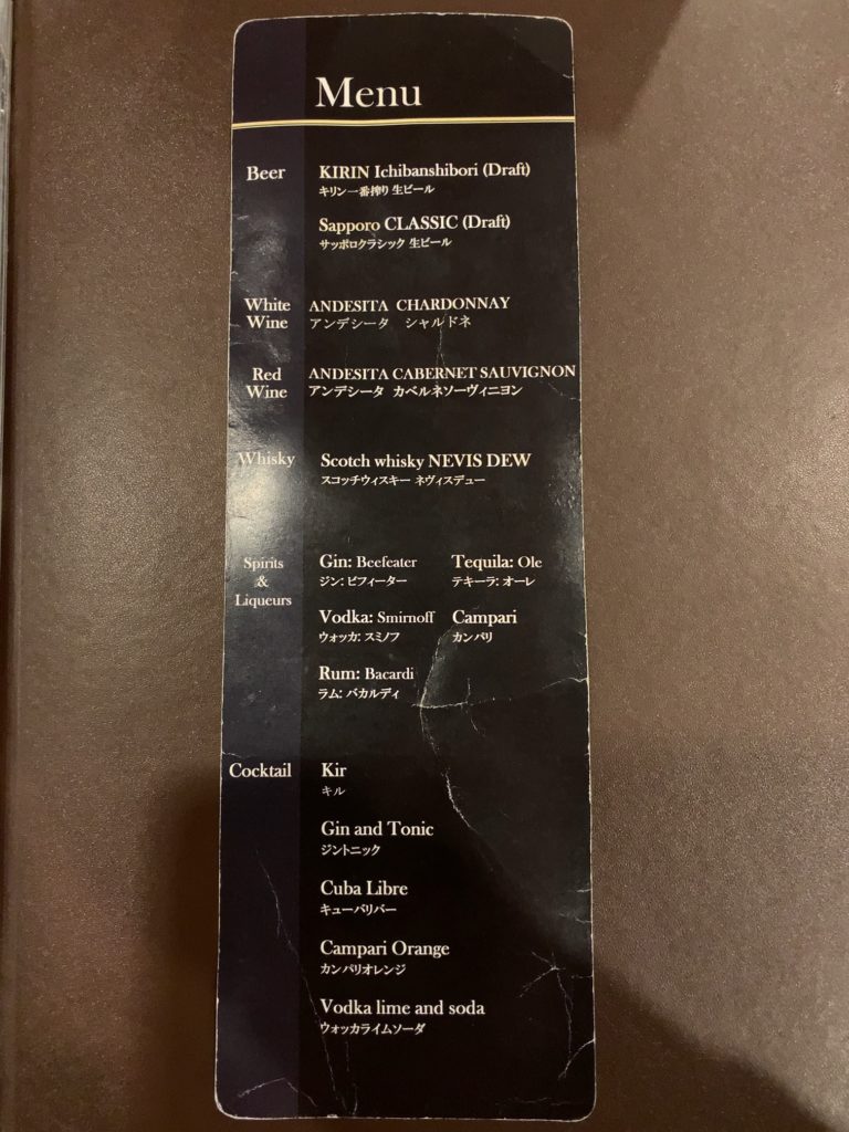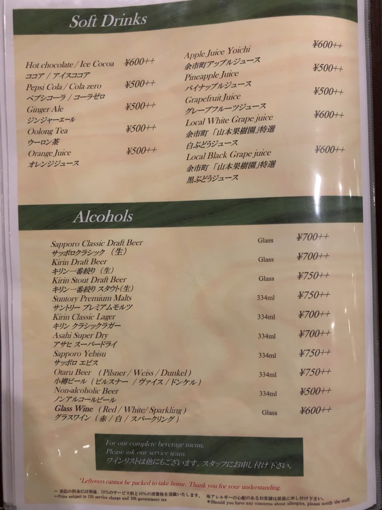 初日はトリビュートに隣接するキロロ温泉(キロロタウン内 遊湯館)に行きましたのでそのついでにトリビュートのアルパインブラッセリーでイブニングカクテルを頂きながらディナーを頂きました!2日目は朝からがっつりスキーをしましたのでトリビュートに移動するのは面倒で、シェラトンでイブニングカクテルを頂いた後に隣のリビエルージュでしゃぶしゃぶブッフェを頂きました!