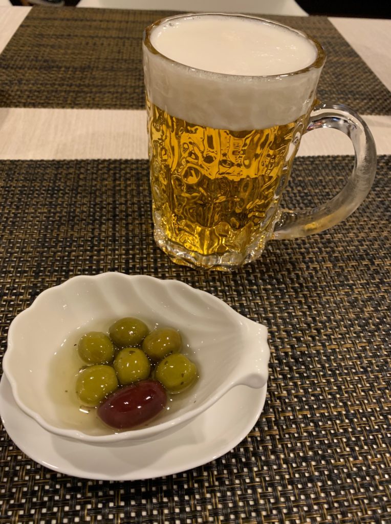 まずはオリーブをおつまみにサッポロクラシックで乾杯!
