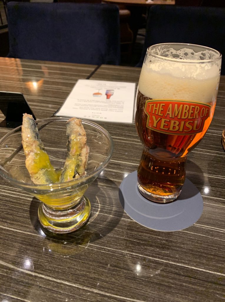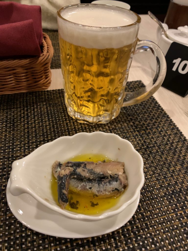 2杯目は琥珀エビス!オイルサーディンはトリビュートのアルパインブラッセリーと比べると盛り付けがいい感じでこちらの方が好みです(笑)