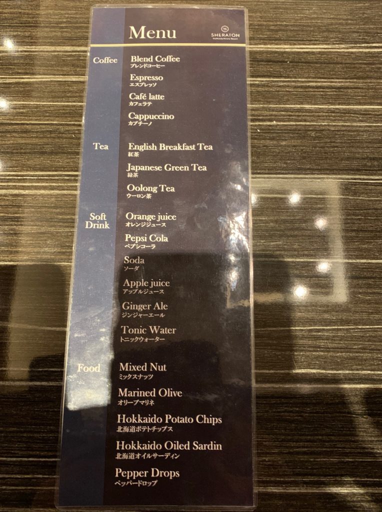 つまりマリオットプラチナ会員以上は17:30~19:30にディナーを注文すると20%割引となり、アルコールやソフトドリンク飲み放題、おつまみ食べ放題が追加になるイメージです。