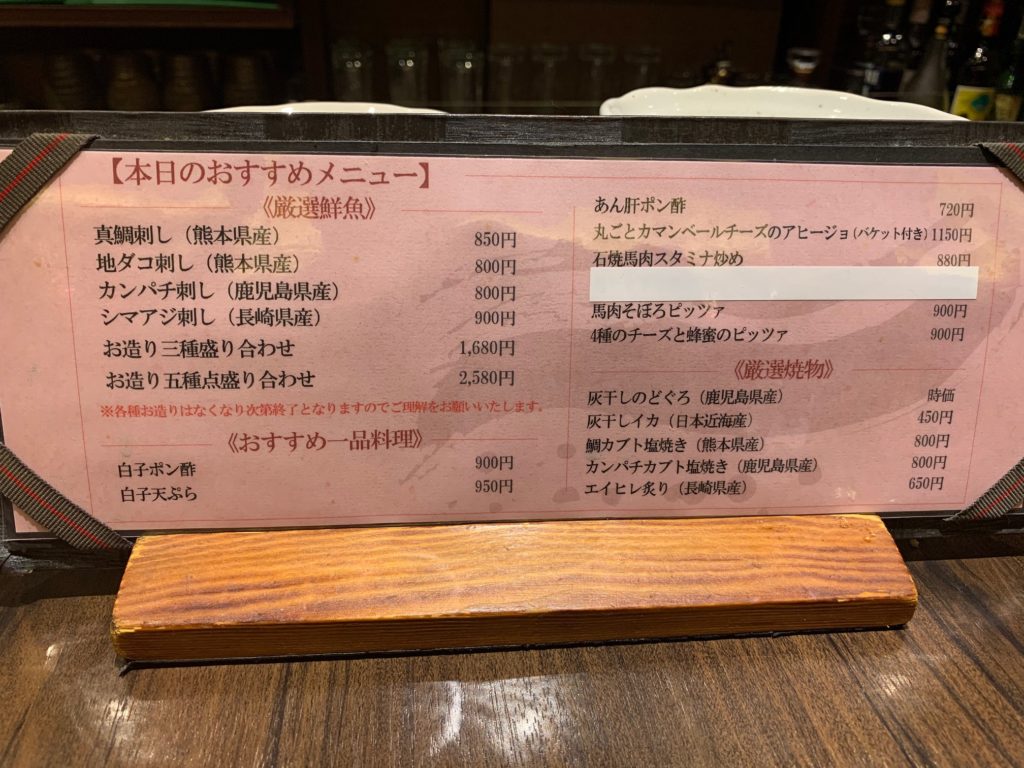 夜遅い時間でしたので軽めにこれだけ頂いて、アルコールを2杯頂き、お会計は5555円とゾロ目でした。馬刺しとお造りを盛り合わせで頂いた割にはそんなに高くない印象です。