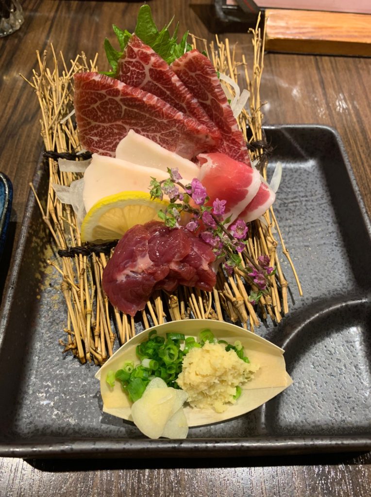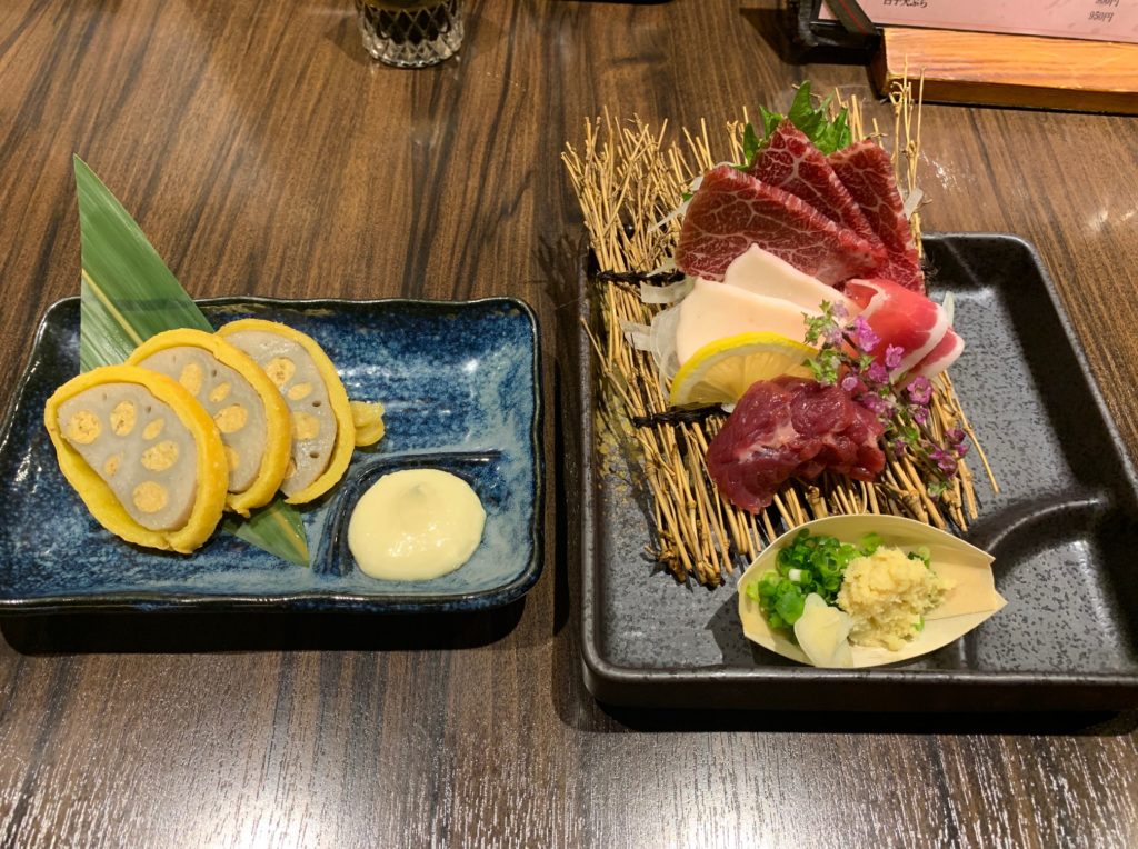 馬刺し盛り合わせ、辛子蓮根(いずれも1名用メニュー)
