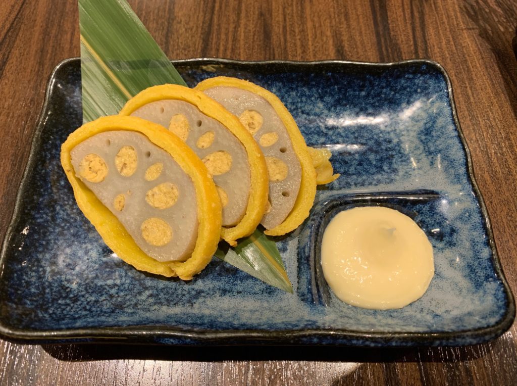 辛子蓮根は熱々で出てきました!熱々の辛子蓮根を食べるのは初めてでしたが、衣がカリッとしていて、辛子の風味が熱い方がより感じられて鼻に抜ける感じがいいです。そしてマヨネーズをつけると辛味がまろやかになり美味しいです。常温や冷やした辛子蓮根より断然美味しい!