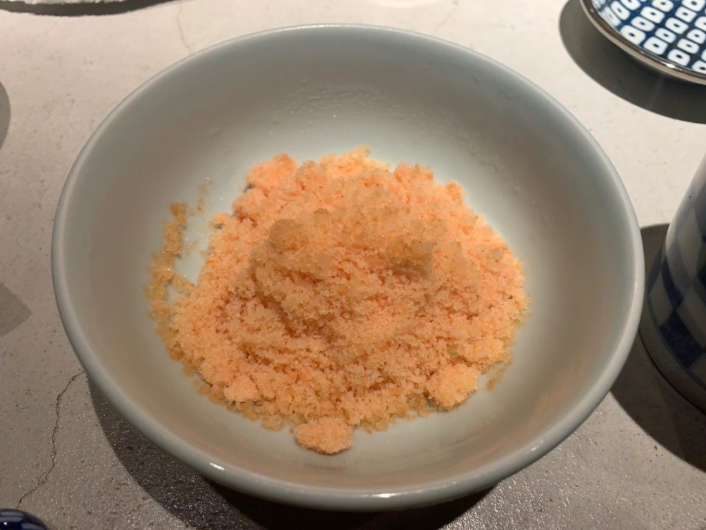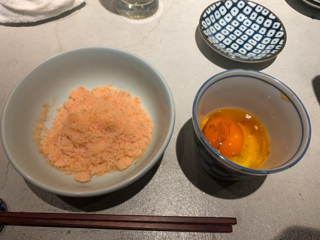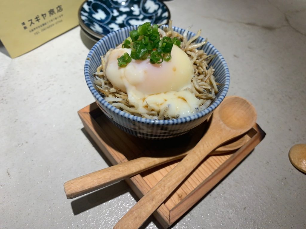しらすの下には長芋が隠れています。温玉をつぶして底に沈んでいる燻製ポン酢と混ぜ合わせると口の中いっぱいに燻製の香りが広がります。食材が燻製されたものは食べたことありましたが、燻製された調味料は初めてでした。調味料を燻製するとこうもすべてが燻製風味になるのかと驚きでした。