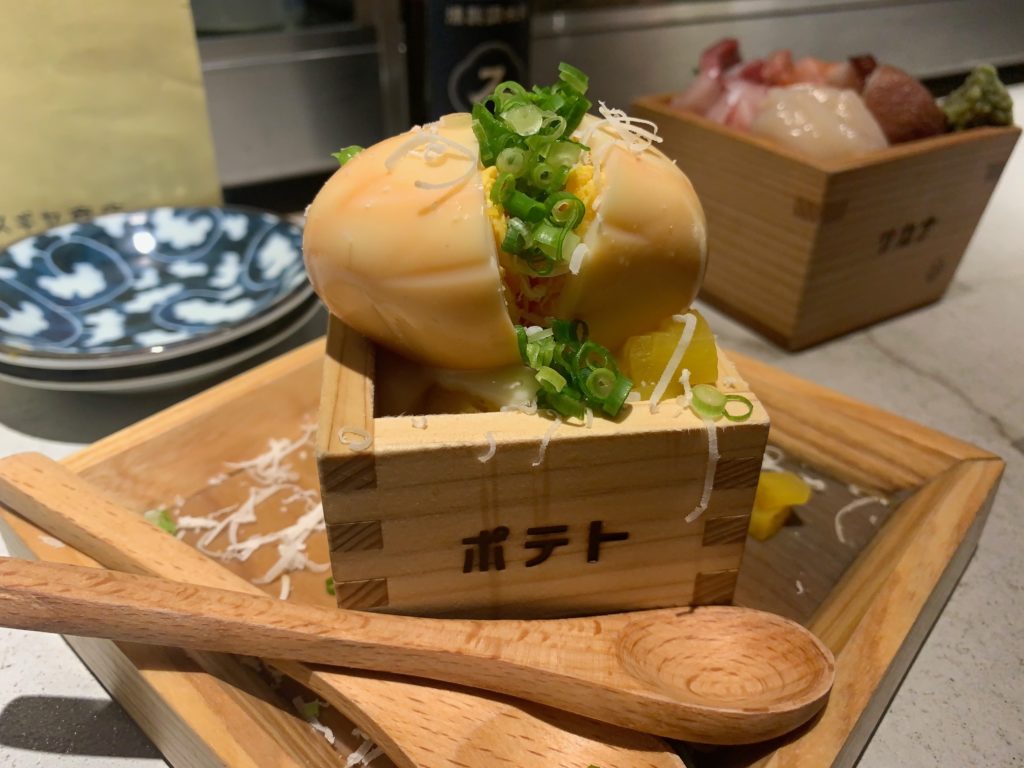 インスタ映えする一品でほとんどの方が注文されてました。下には粗くつぶされたホクホクのポテトと燻製たくあんが入っていますので燻製卵をつぶしてよく混ぜ合わせます。