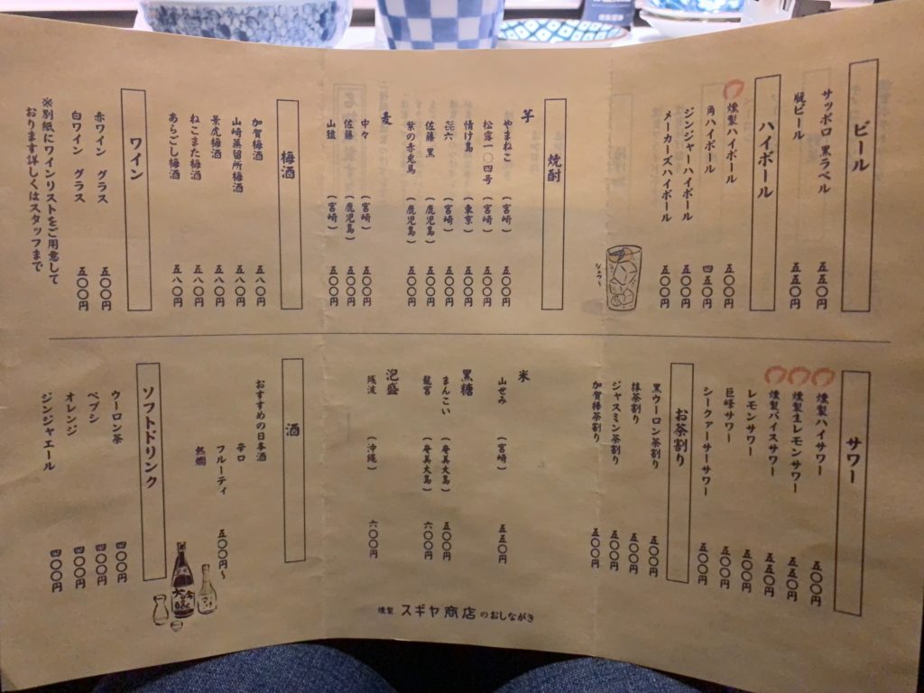 燻製スギヤ商店の概要、メニューや食べたものをご紹介しました!燻製ばっかり食べると飽きるんじゃないかと思いましたが、燻製されている食材や調味料が違うと意外と飽きずに美味しく頂きました~シメはお茶漬けはあるもののバリエーションが少ないですし、一品の量も多くはないので2軒目として軽くつまむ程度に使ったり、こちらで軽く飲んで食べてからラーメンなどで締めるなどの使い方がいいのかなぁと感じました。