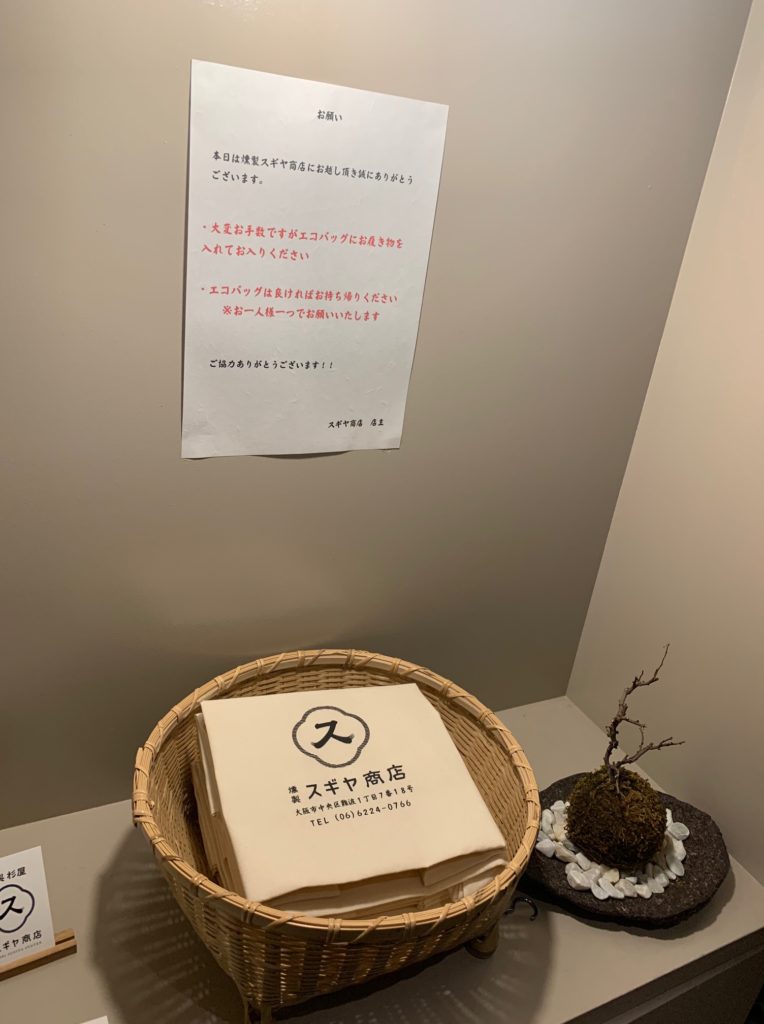 カウンター上のこの貼り紙と靴を入れるエコバッグを見てようやく安心できます(^^;)