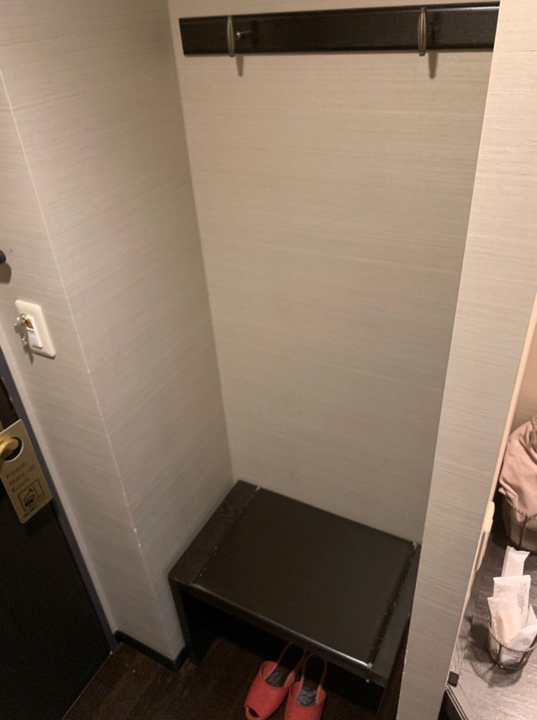 左手は荷物台とハンガーフックです。スリッパが置かれています。