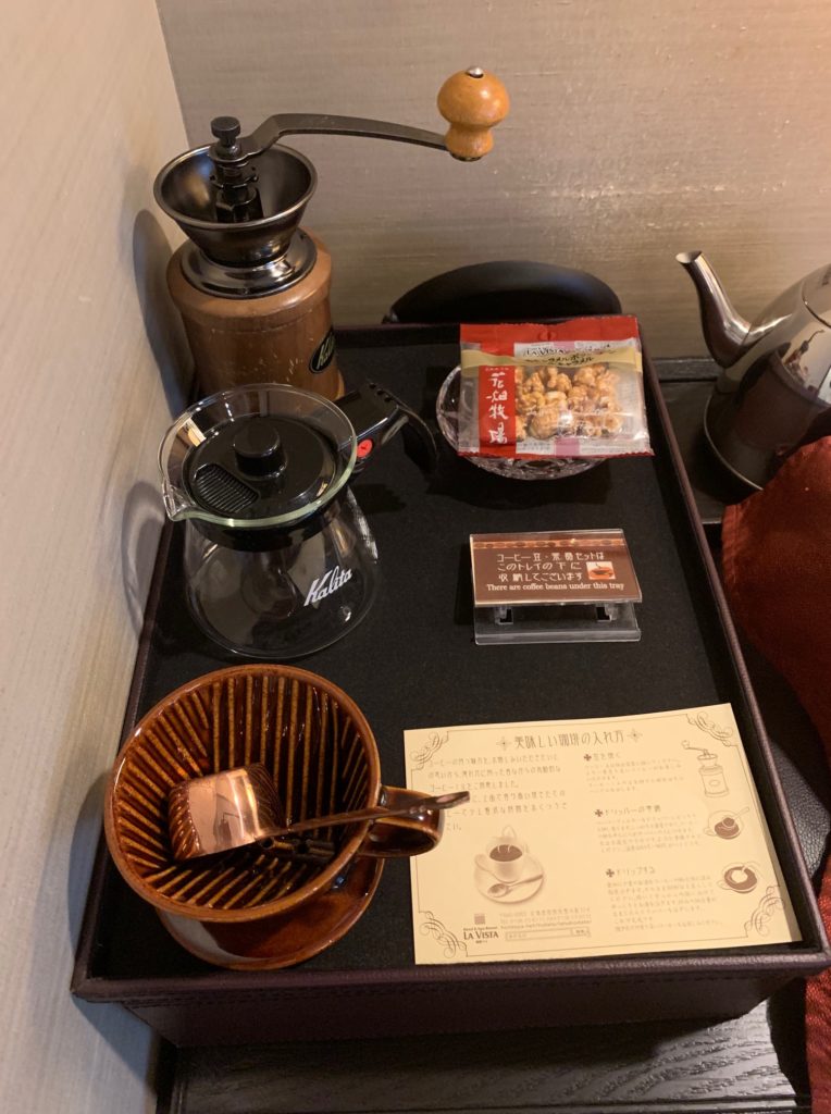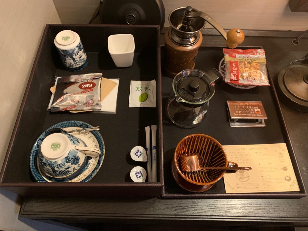 箱の中にはお茶碗、カップ&ソーサ、インスタントコーヒー、煎茶ティーバッグ、砂糖、ミルク、トレーの上にはコーヒーミル、コーヒードリッパー、ガラスポッド、花畑牧場キャラメルポップコーン