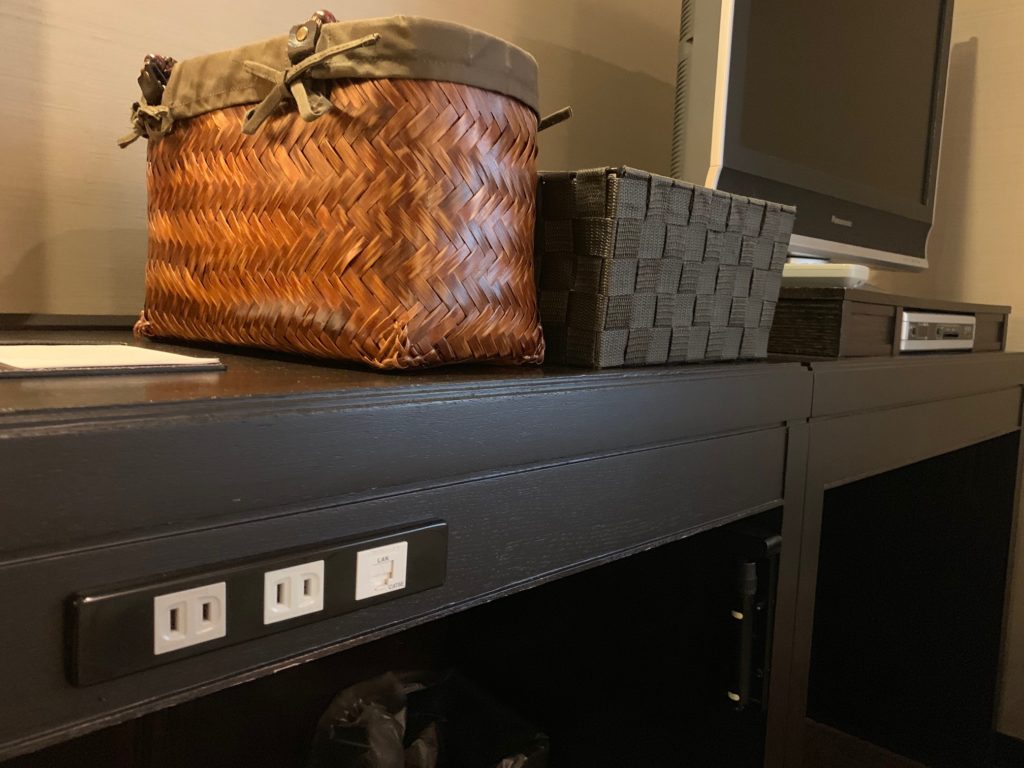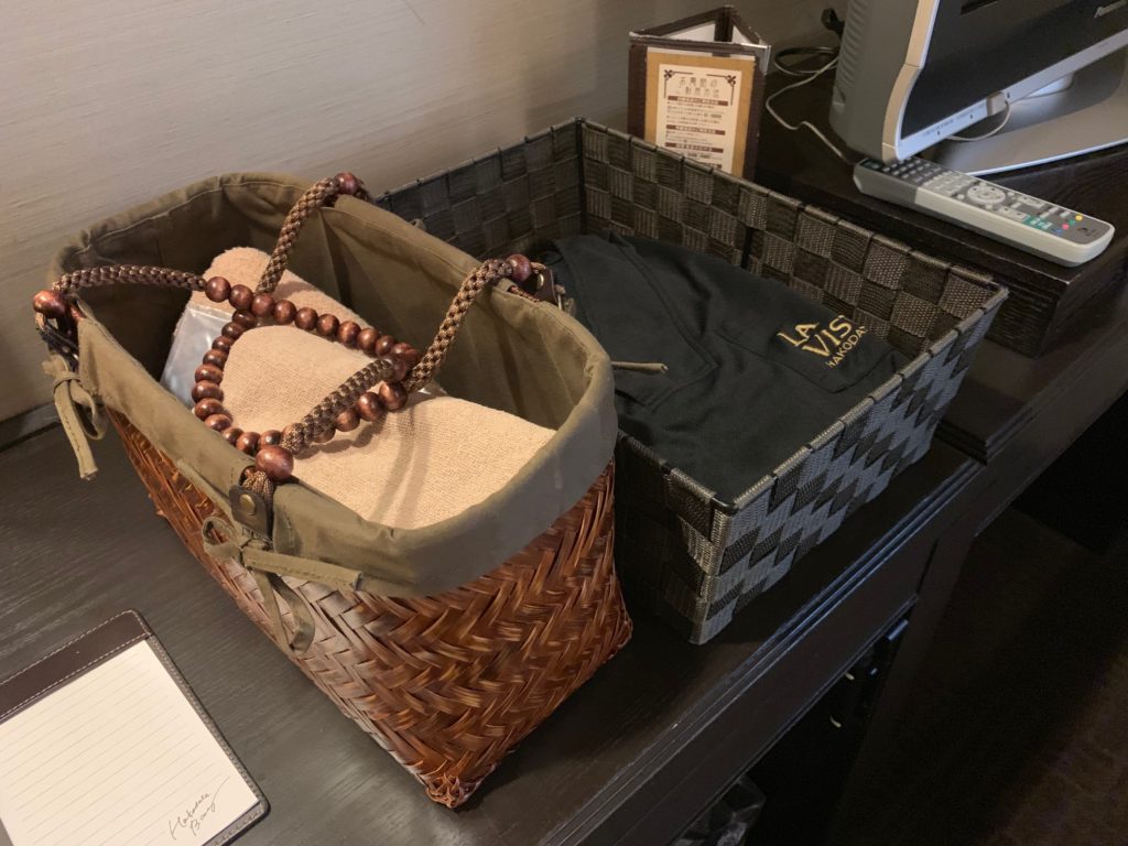 テレビの横には大浴場に持っていくカゴがあります。中にはバスタオル、フェイスタオルとナイロン袋が入っています。黒いかごの中には作務衣が入っています。これは館内で着ていてもOKですので大浴場や朝食会場でこちらの作務衣を着た方がたくさんいます。