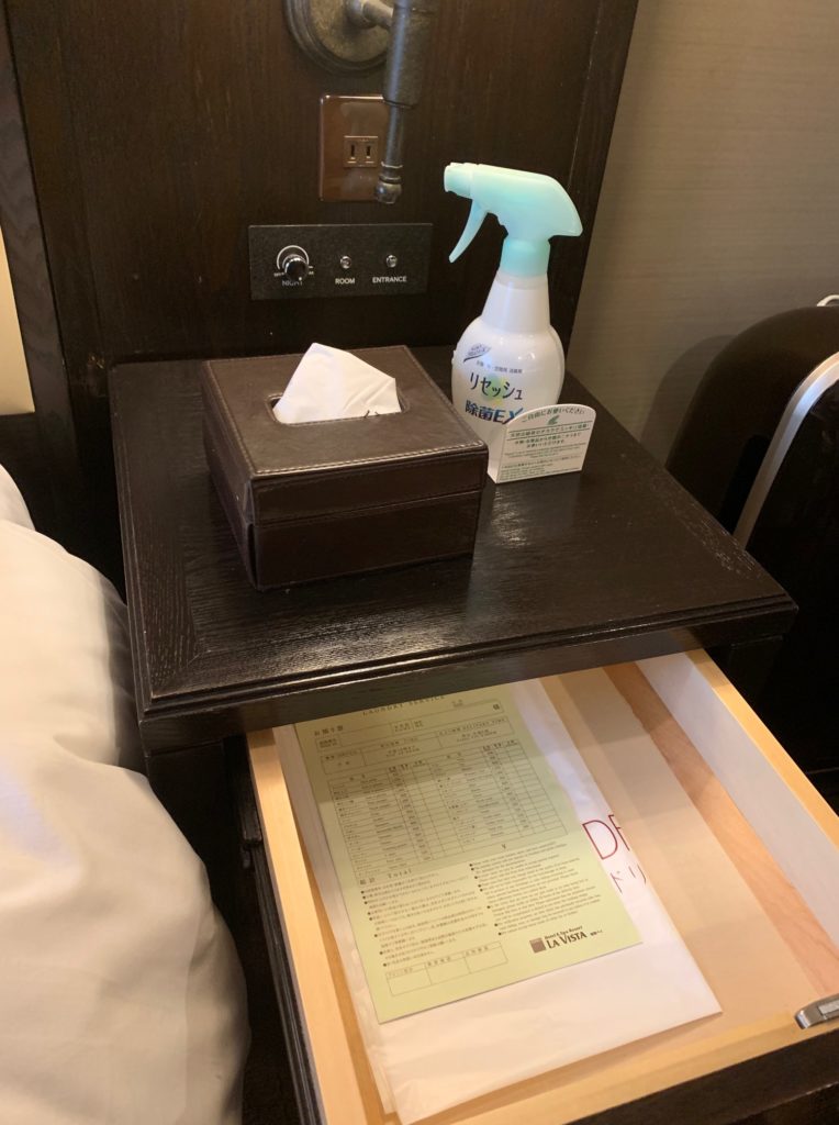 枕元にはコンセント1口と電源のスイッチがあります。ティッシュやリセッシュも置かれています。