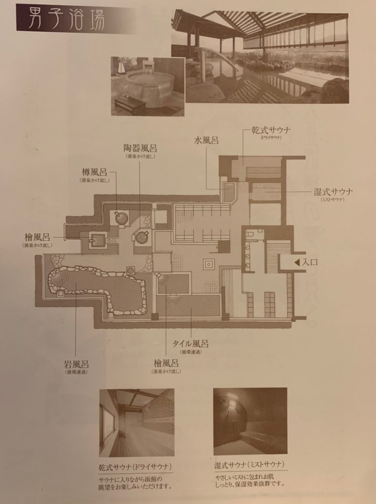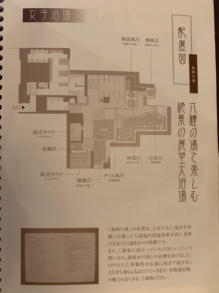 お風呂自体は男子浴場、女子浴場とも変わりないようで、陶器風呂、樽風呂、檜風呂は源泉かけ流し、岩風呂とタイル風呂は循環濾過となっています。