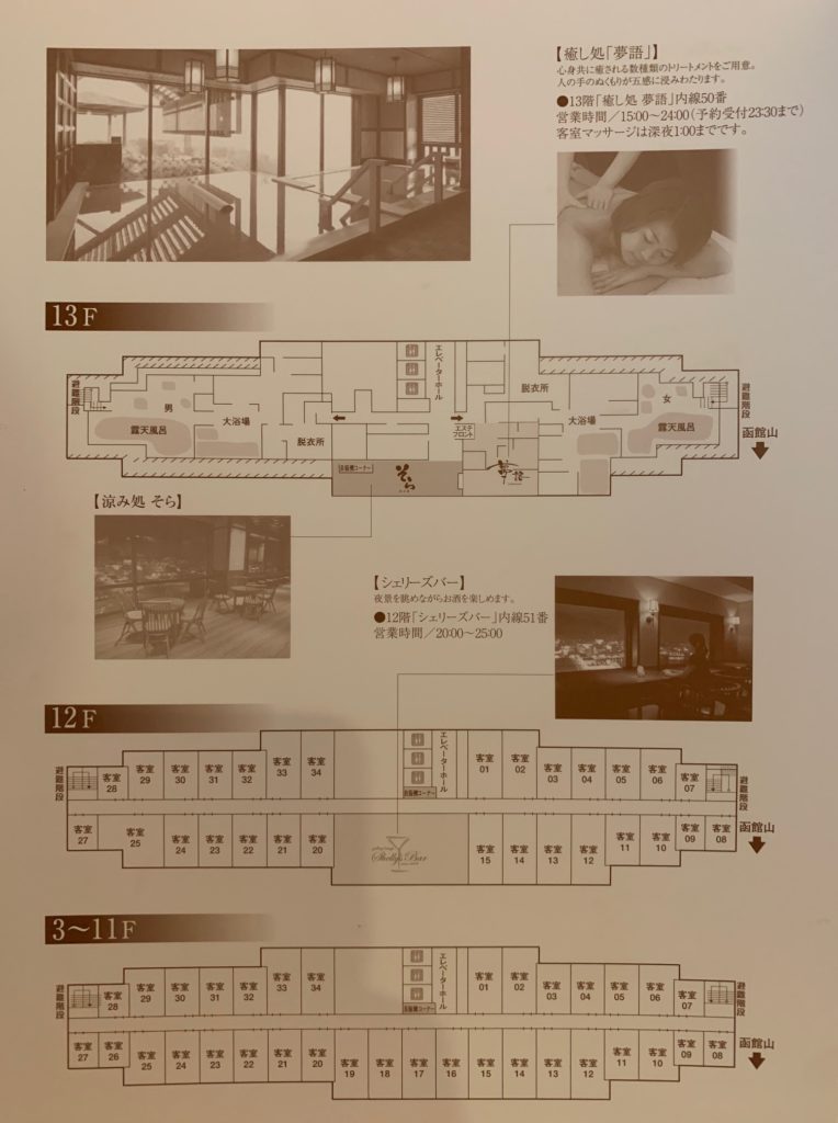 最上階の13階にある温泉大浴場「海峡の湯」は眼下に函館の景色を望みながらゆったりと源泉かけ流しを含めた温泉を楽しめます。詳しくは記事後半をご参照下さい。
