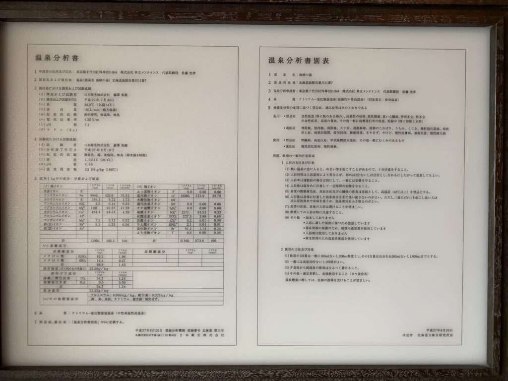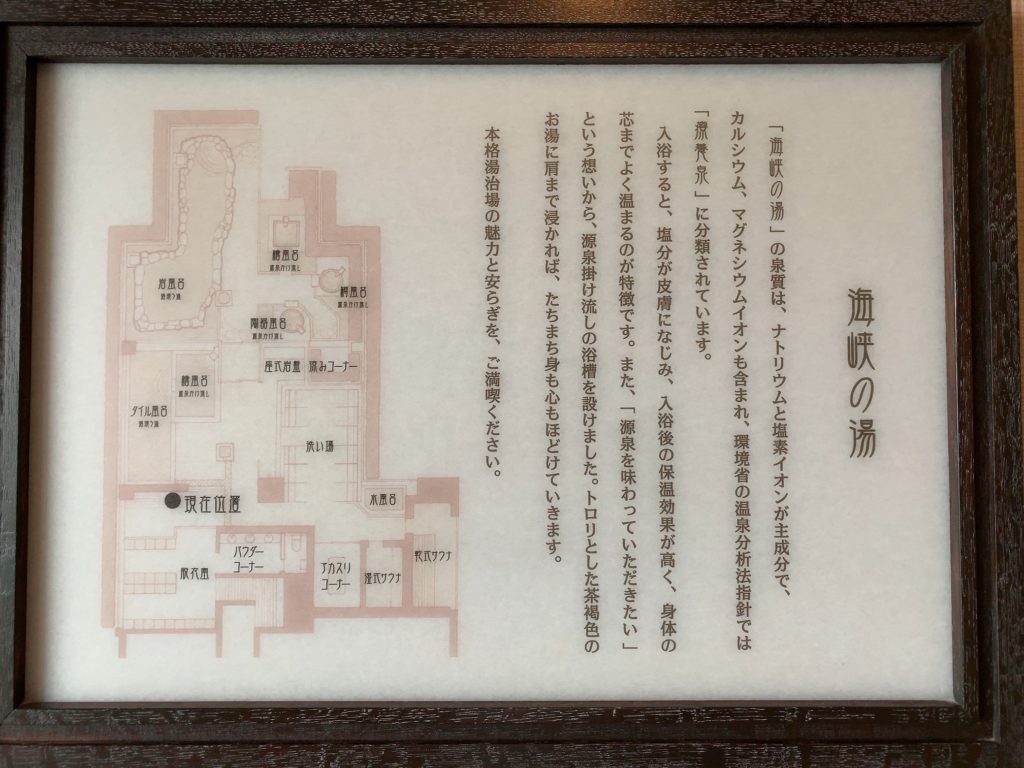 温泉の説明や成分分析表です。茶褐色の湯は、療養泉に分類される泉質で、身体の芯までよく温まります。