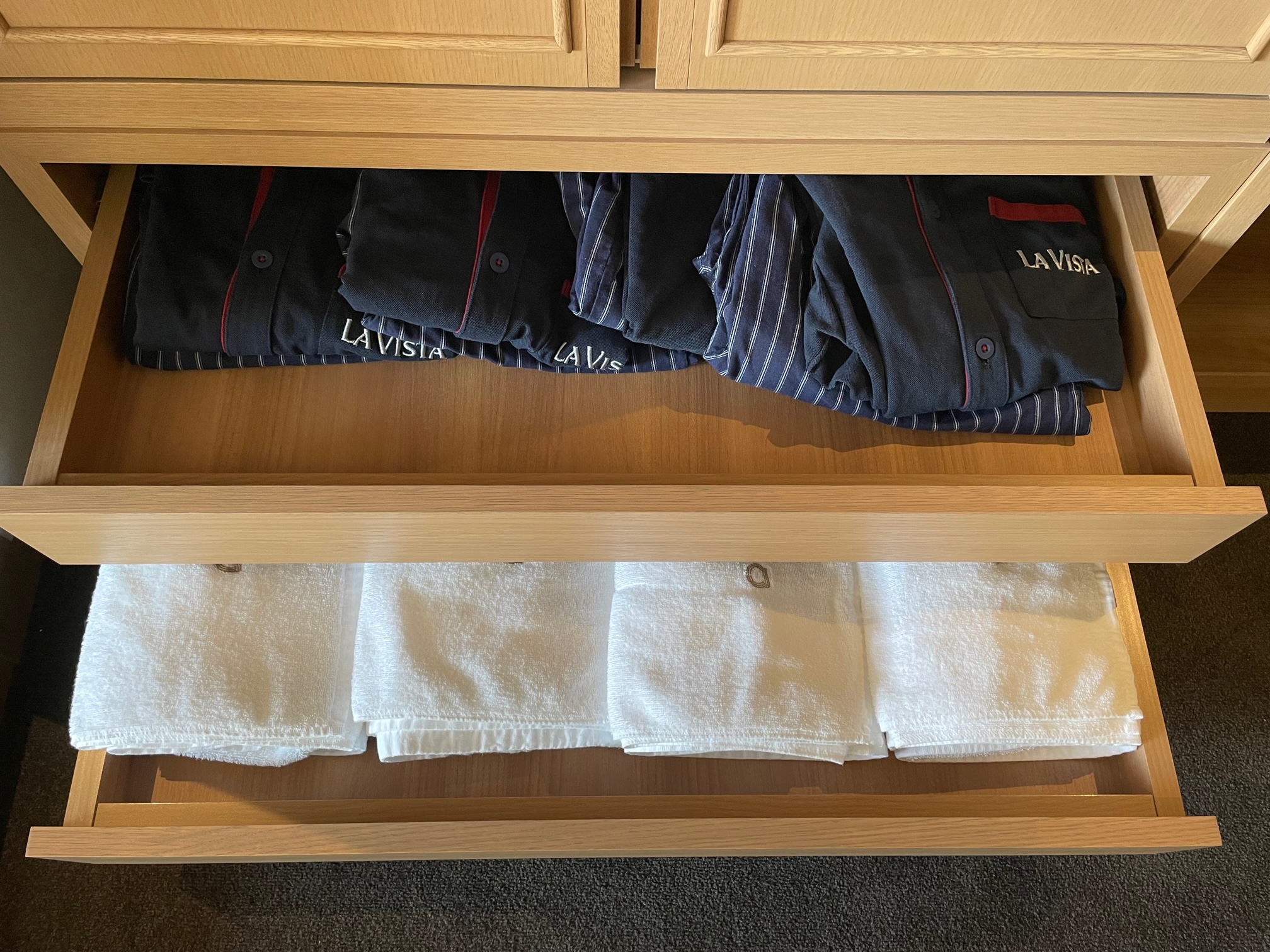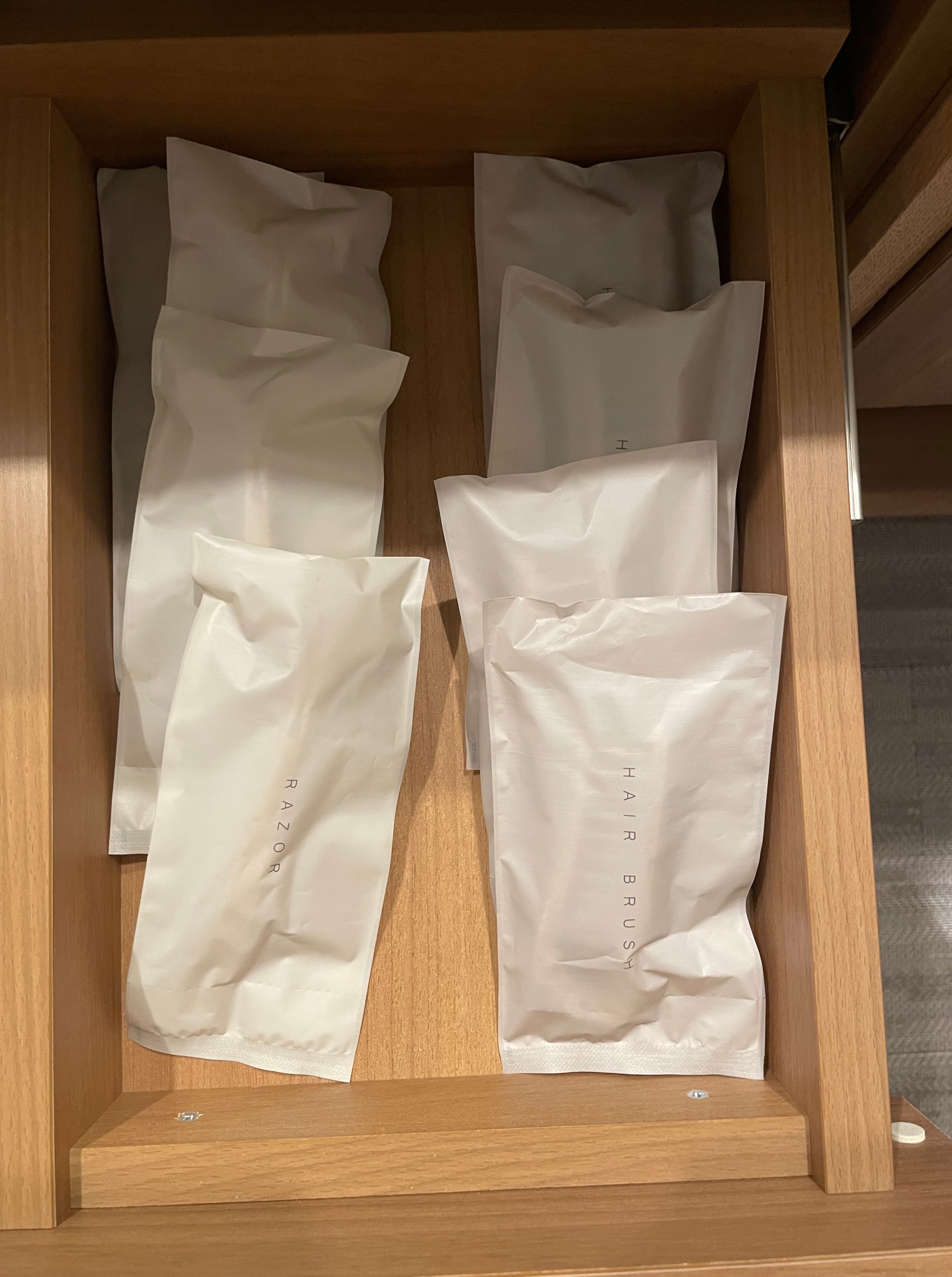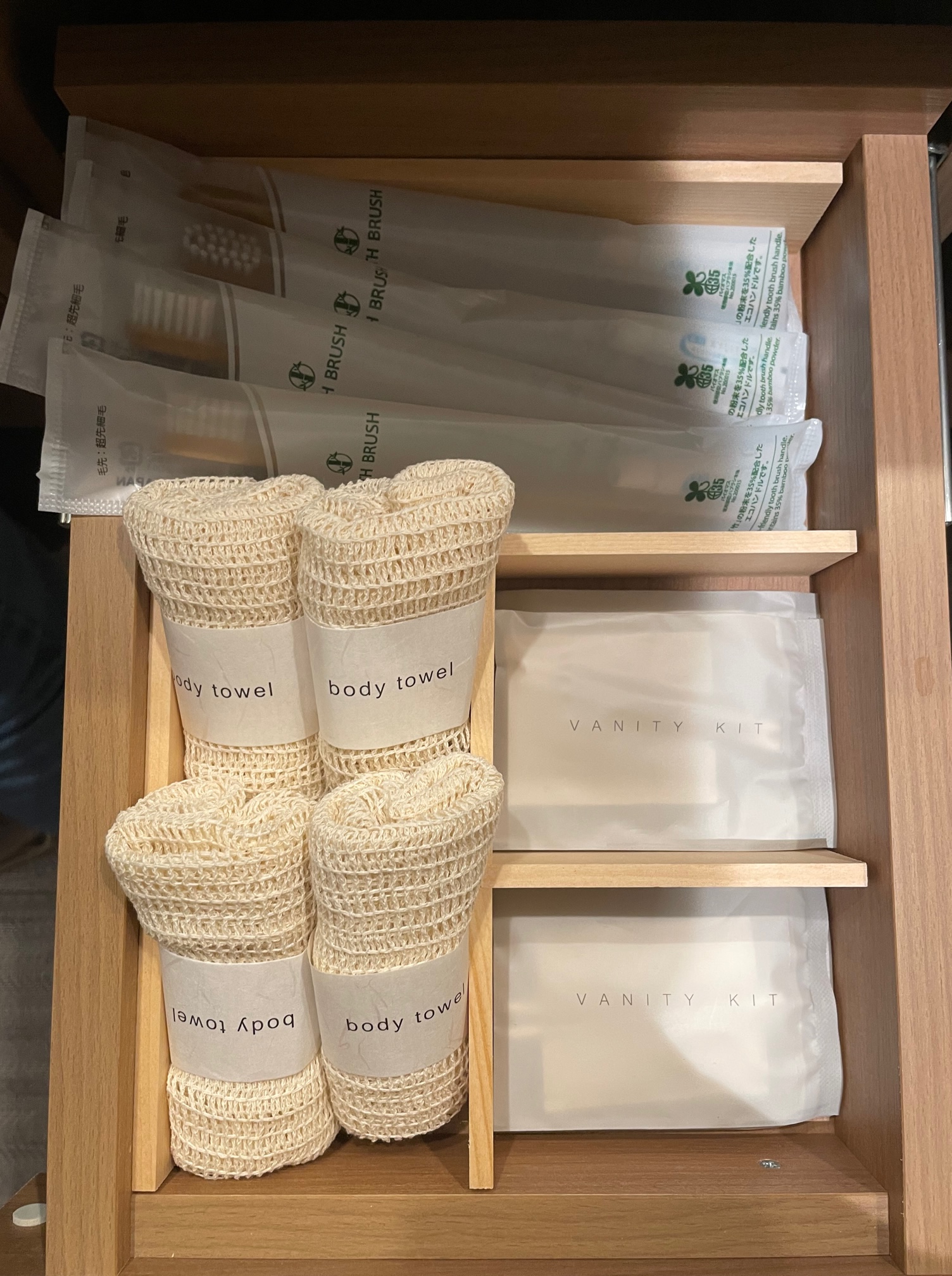 引き出し左側は歯ブラシ、ボディタオル、バニティキット