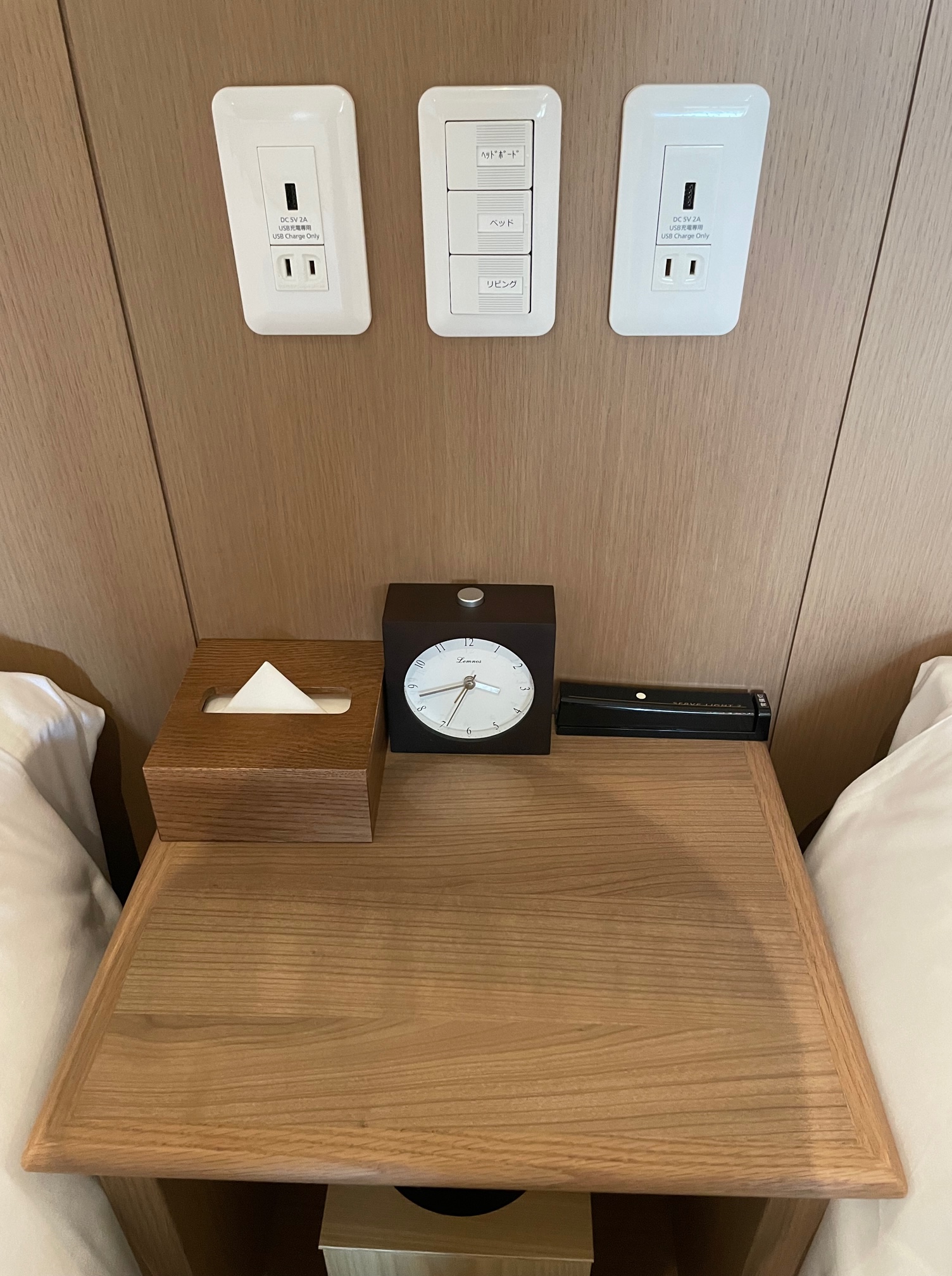 2つのベッドの間には照明のスイッチとそれぞれのベッドにコンセント1口、USBコンセント1口が設けられています。