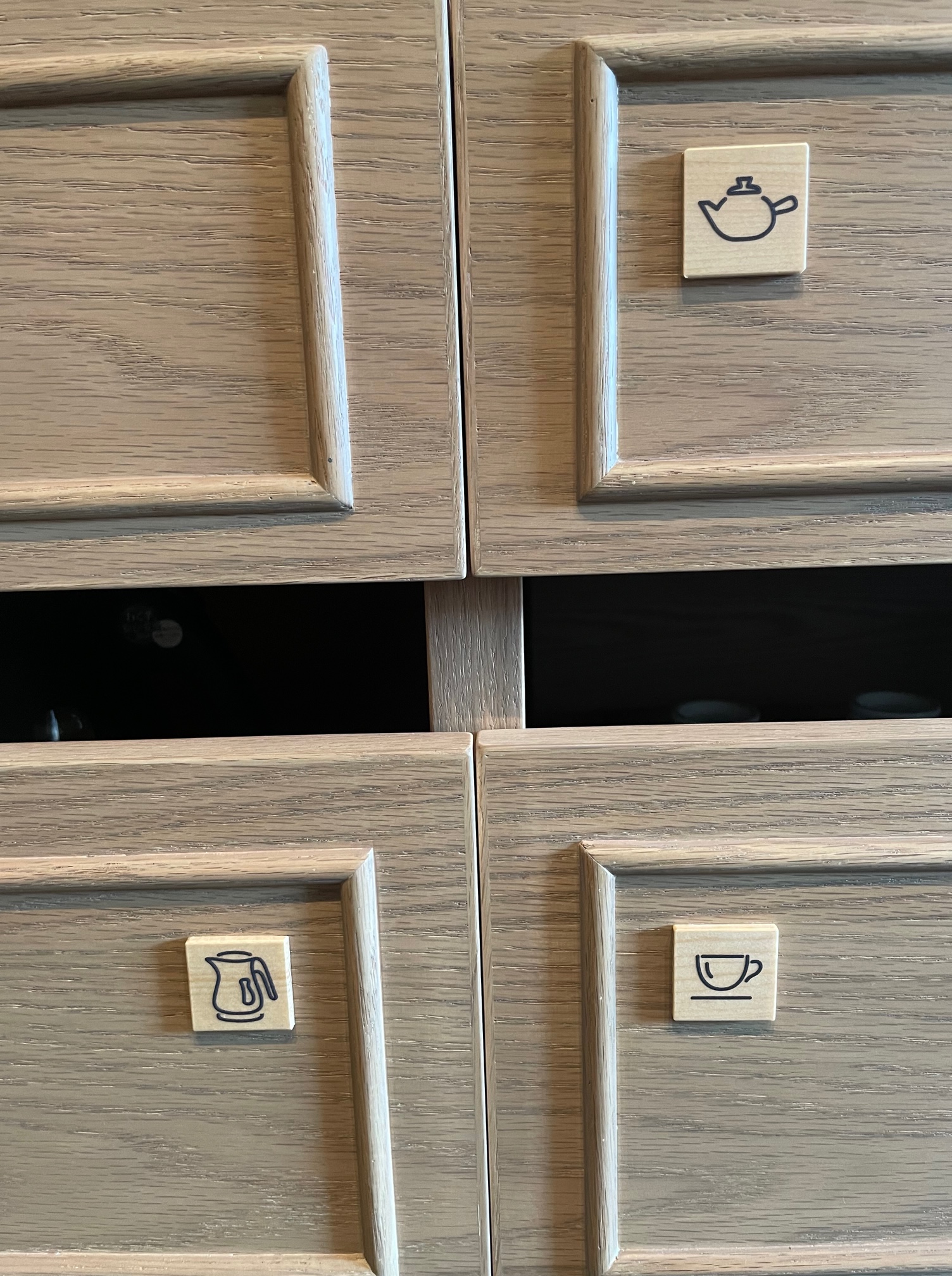 キャビネットの引き出しにはユニバーサルデザインのピクトサインがついていて何が入っているのかわかりやすいです