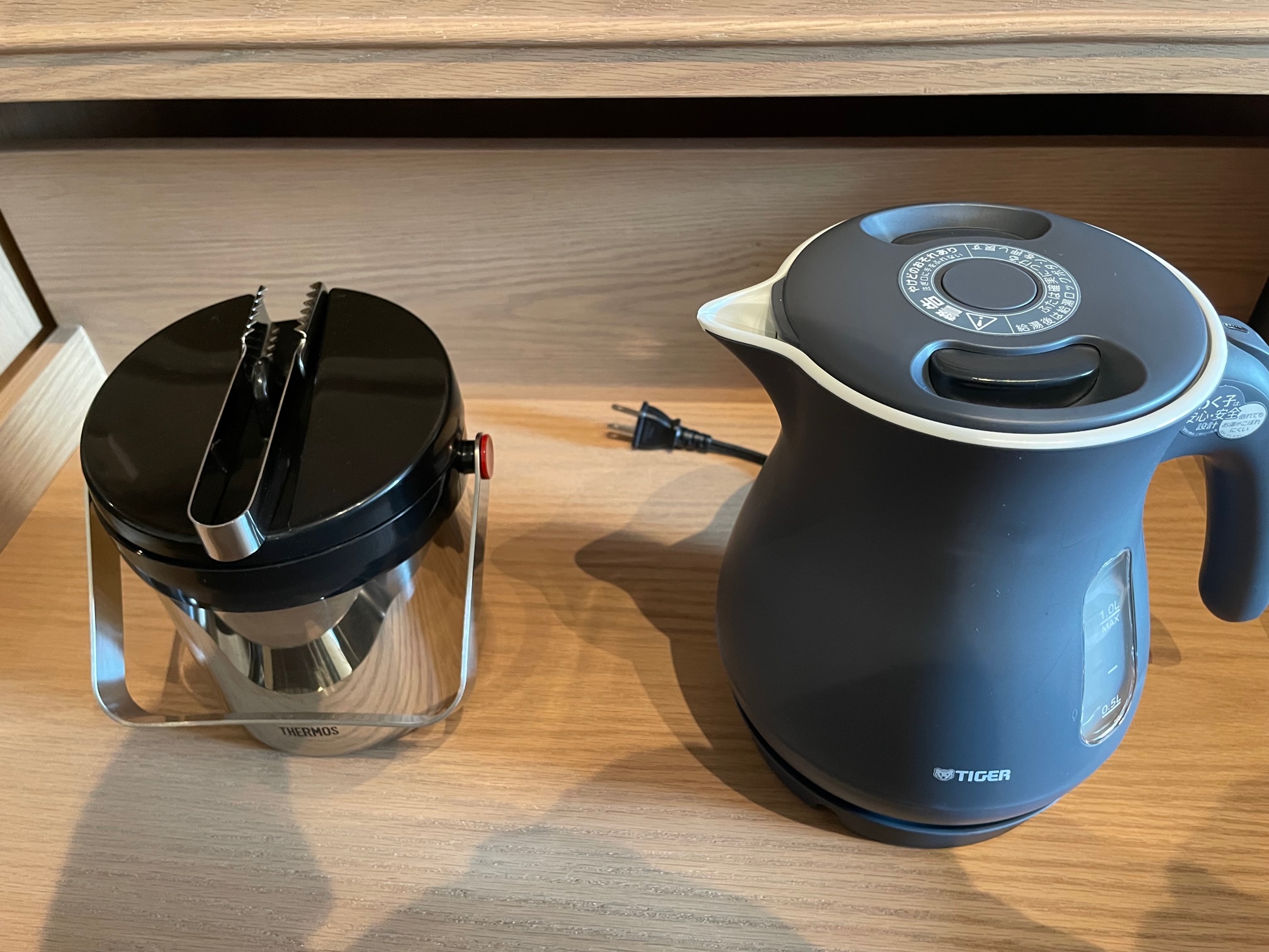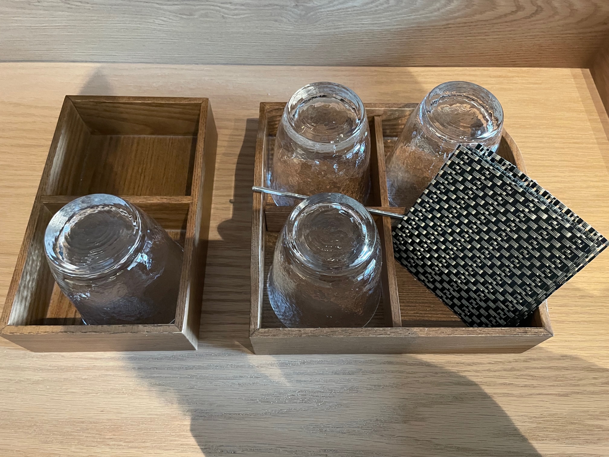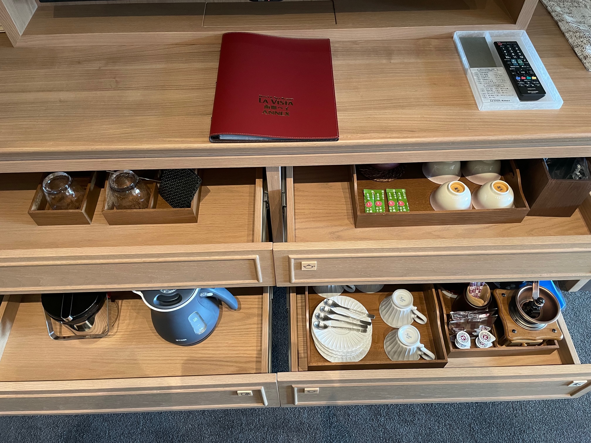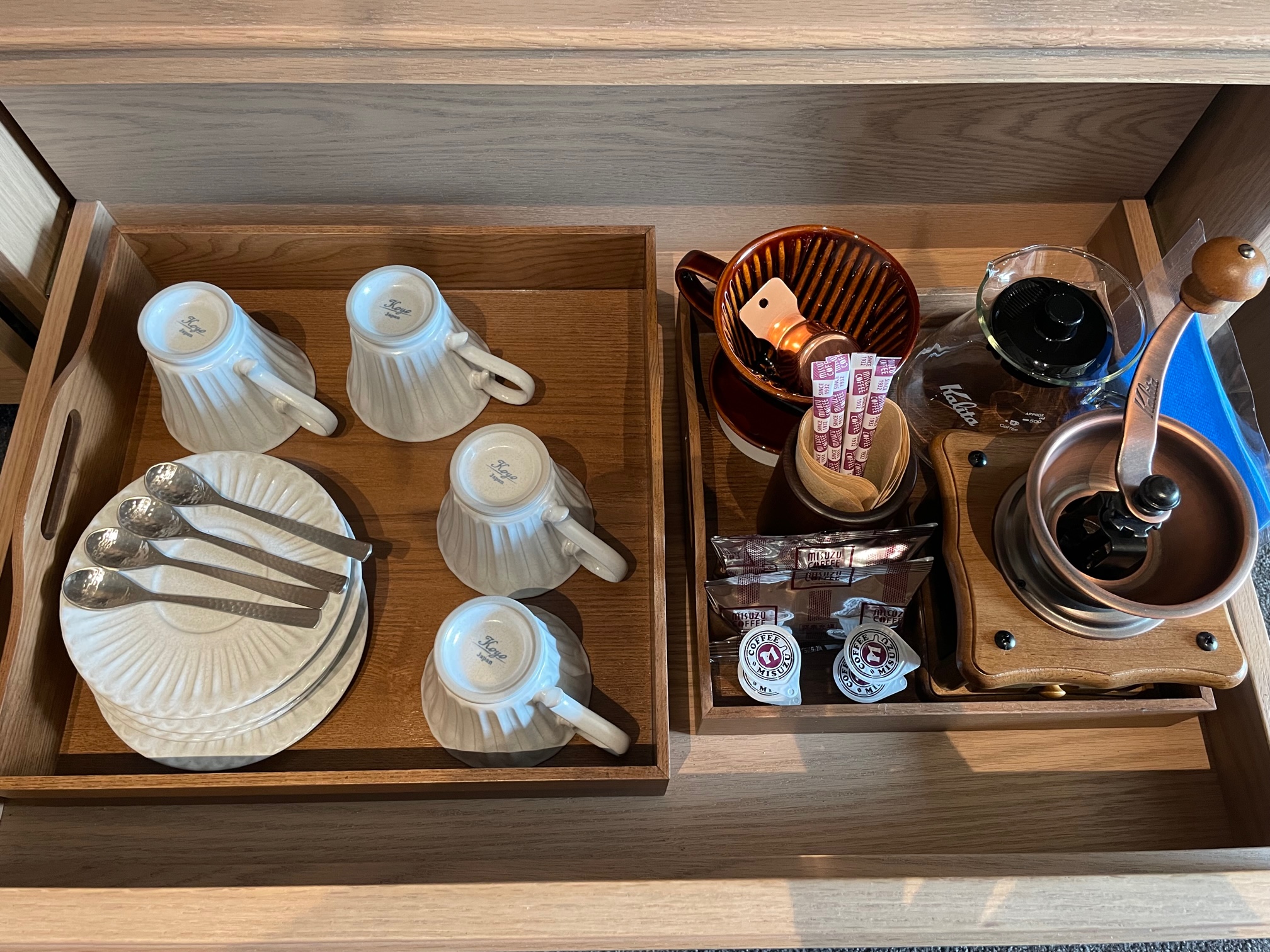 右下の引き出しにはカップ&ソーサ、コーヒーミルセット。コーヒーミルで挽きたてコーヒーを飲めるのは本館の方のラビスタ函館ベイも同じです。