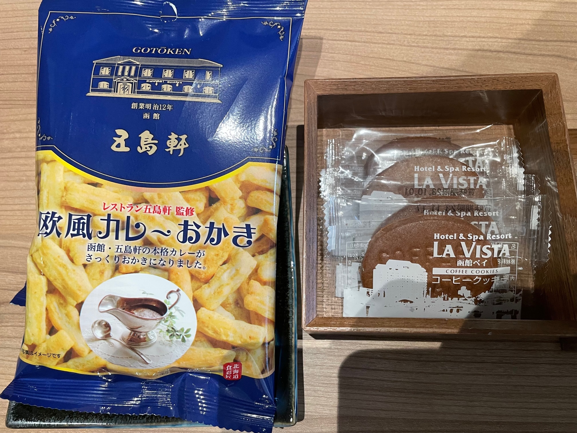 ソファーの前のテーブルの上にはお菓子が置かれていました。五島軒の欧風カレーおかき、ラビスタのコーヒークッキー