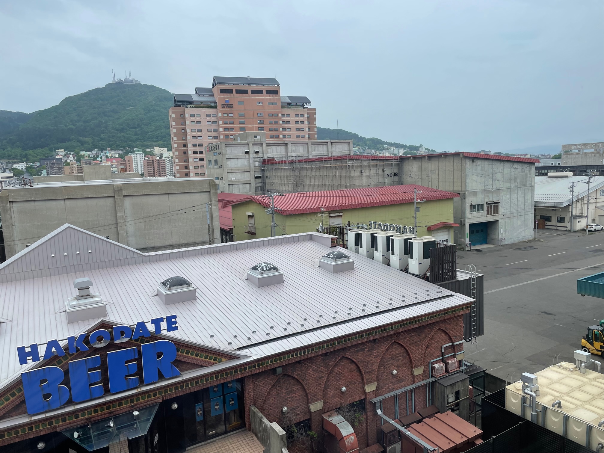 奥の窓からは函館山とラビスタ函館ベイが見えます。低層階のため海は見えず…
