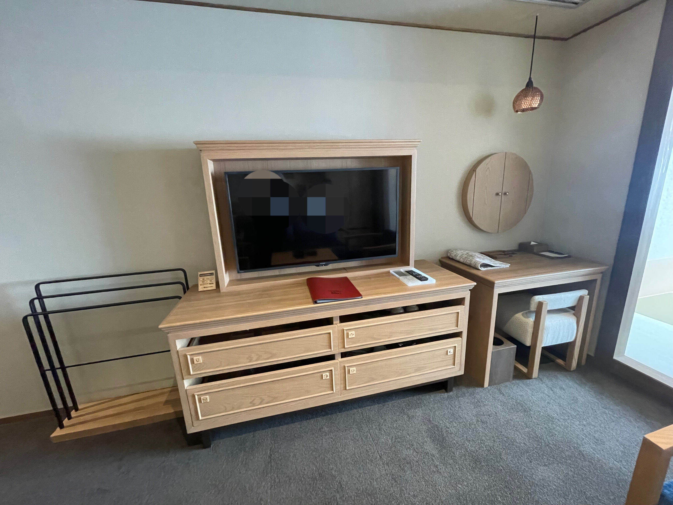 リビングルームにはタオル掛け、テレビ、キャビネット、小さな鏡台が置かれています