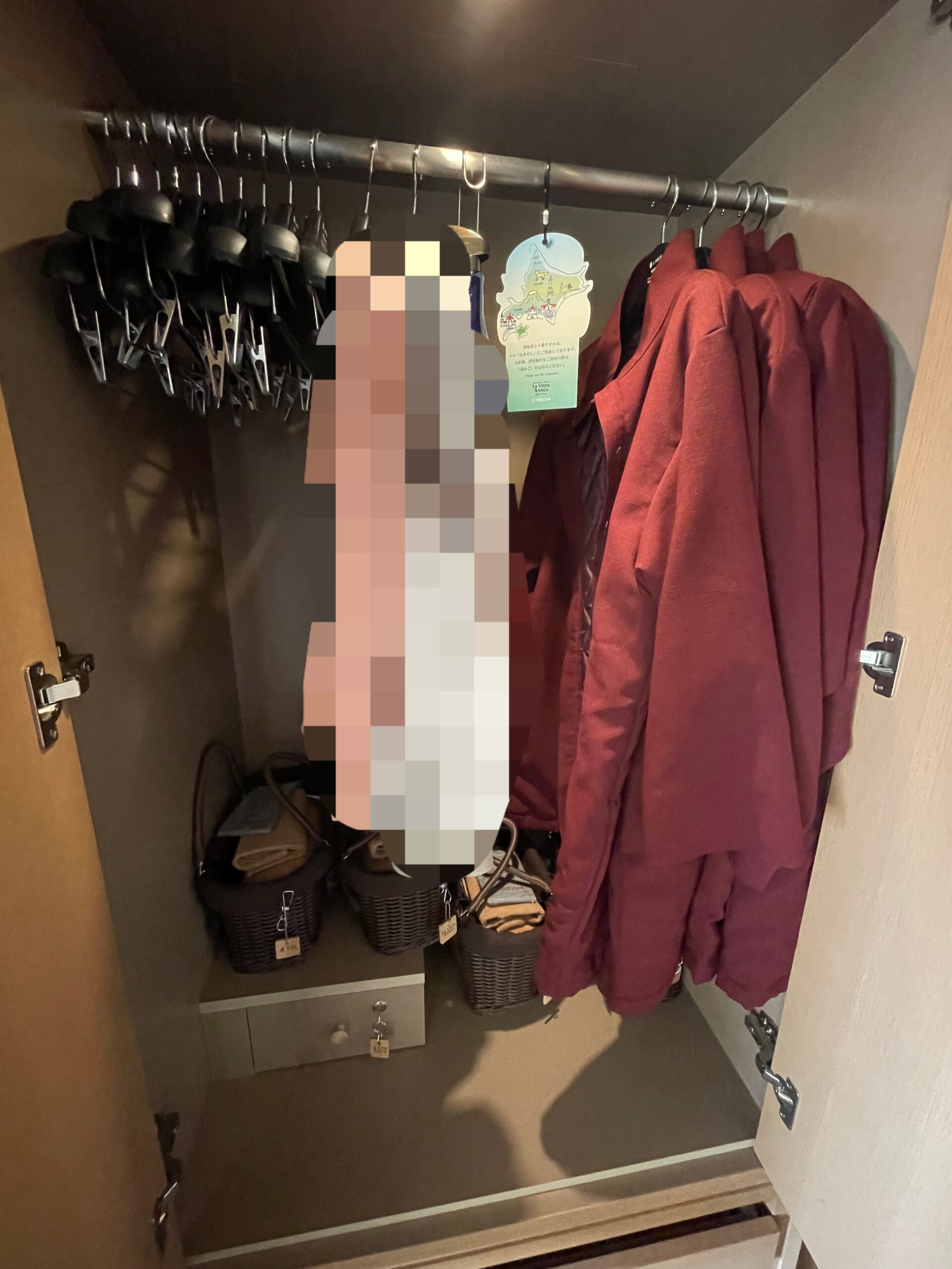 クローゼットの中には館内着の上から羽織る半纏?羽織?、湯かご、セーフティボックス