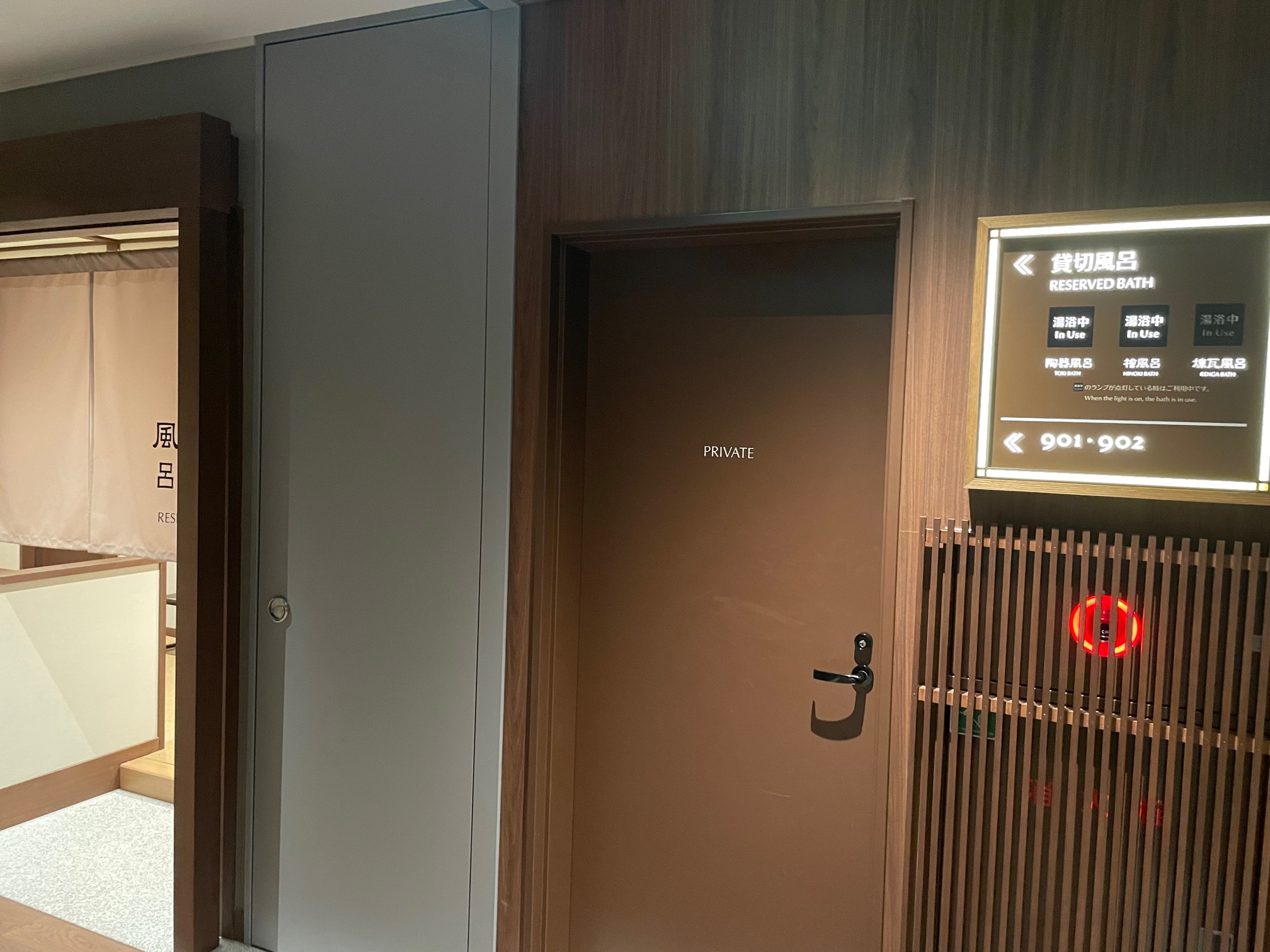 9階には貸切風呂があります。「陶器」「檜」「煉瓦」の3種類があり、9階エレベーターホールから貸切風呂に行く途中に下の写真のようなランプがあり使用中かどうかわかるようになっています。特に予約は不要なのでランプが点灯していない貸切風呂は自由に使用することができます。
