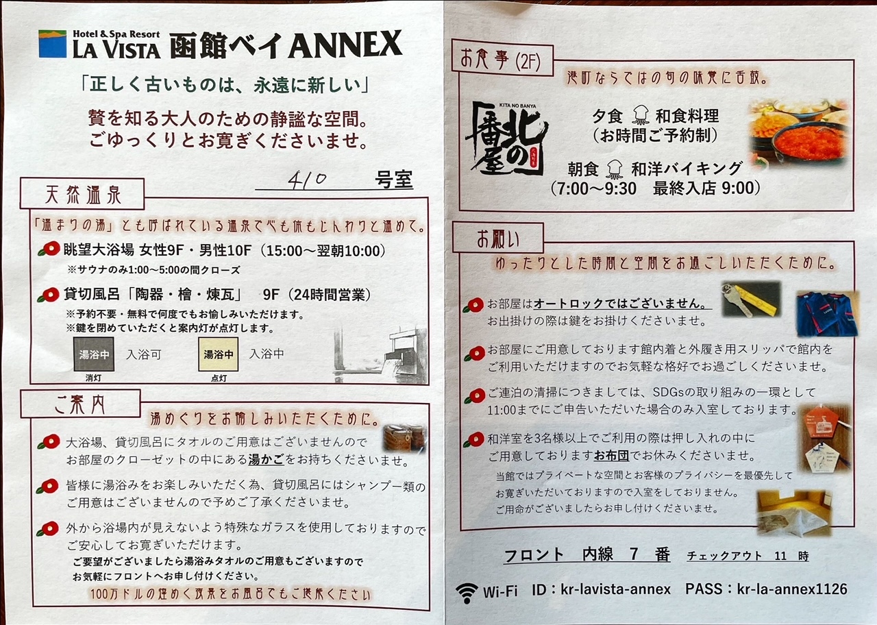 ラビスタ函館ベイANNEXは客室数74室、収容人数248人とそれほど大きなホテルでないわりに、朝食会場である北の番屋は席数が148席と十分ありますので、本館のラビスタ函館ベイではいつ行っても朝食の待ち時間がある印象ですが、ANNEXでは朝食の待ち行列はほとんどありませんでした。