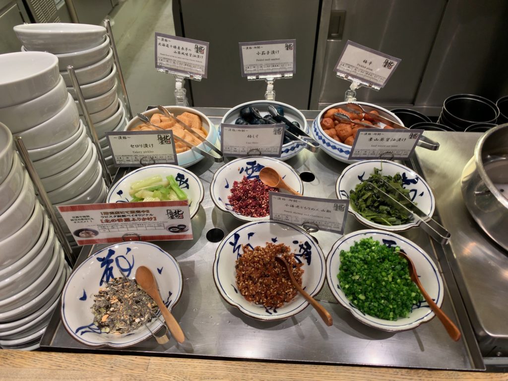 ラビスタ函館オリジナルの北の番屋ふりかけ、小海老とちりめん山椒、葉山葵醤油漬け、梅しそ、セロリ漬け、北海道十勝産長芋の山葵風味醤油漬け、小茄子漬、梅干