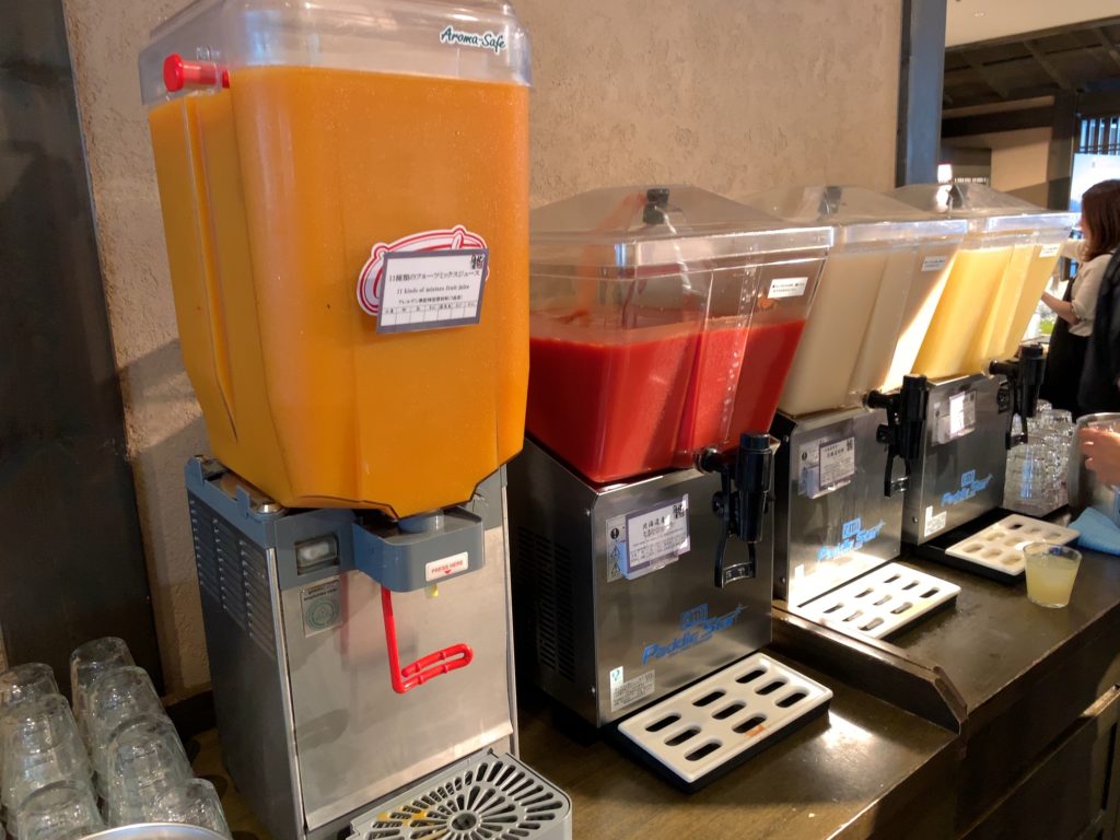 11種類のフルーツミックスジュース、北海道産とまとジュース、乳酸菌飲料(カツゲン?)、リンゴジュース