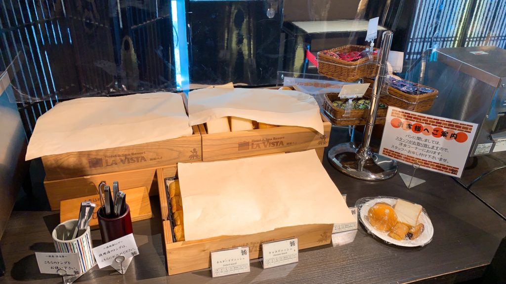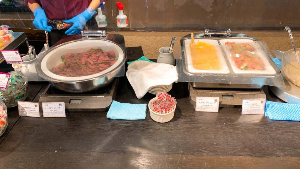写真を比較してご覧になってお分かりいただけると思いますが、和食は盛り合わせとなって選択の自由度は減っているものの品数は比較的維持されています。洋食の品数が減っている、サラダの種類も少ない、ソフトクリームの機械が使えない、飲み物の選択肢も少ないなどなど、もちろん従来のビュッフェと比べると自由度が低く、メニューも減っています。しかし、下の写真のようにラビスタ函館ベイの朝食らしい雰囲気は楽しめることは間違いないでしょう!