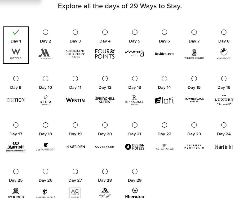 ちなみに毎日1つずつのホテルブランドにちなんだゲームをしてクイズに答えると賞品がもらえます。初日は「W」というホテルブランドについてのゲームとクイズでした。2日目以降は以下のようになっています。