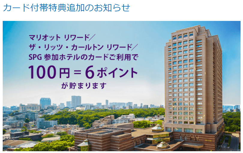 マリオット・SPGホテル利用時の「100円=6ポイント」キャンペーンは2018年12月31日までの期間限定でしたが永続的な付帯特典となりました。