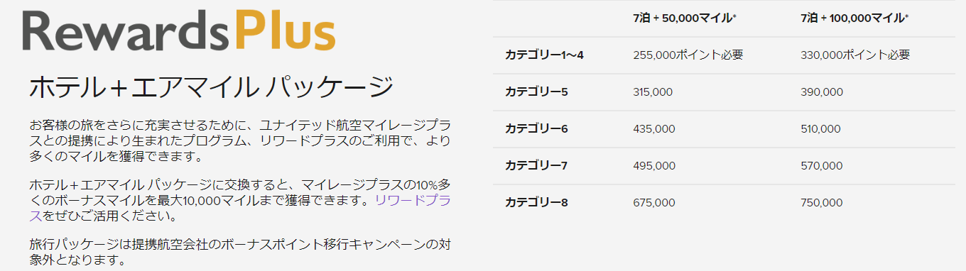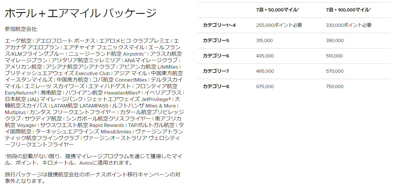 「航空券とホテルのパッケージ」という選択肢もあります。航空マイル+マリオットの無料宿泊(7泊)にポイントを交換できます。