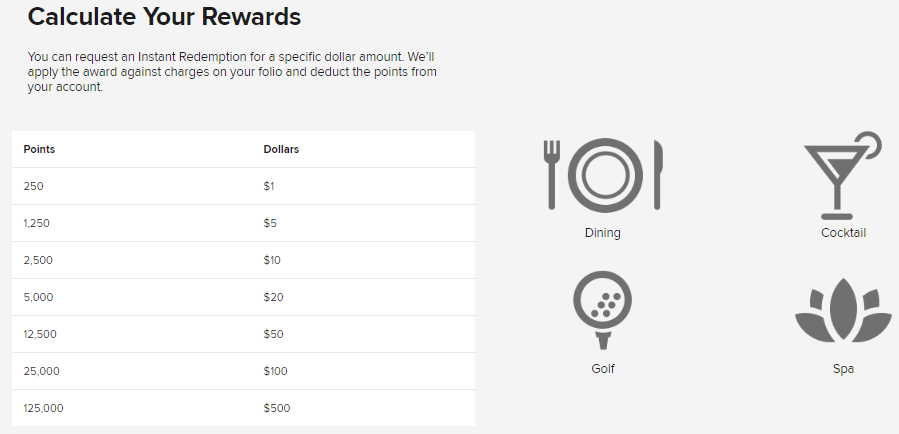部屋付で利用した代金について、250ポイント=1US$の交換レートで精算に利用することが可能で250ポイント(1米ドル相当)から交換できます。この場合は1ドル110円で考えると1ポイントが0.44円相当となりあまりお得な方法ではありません。
