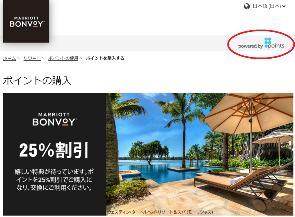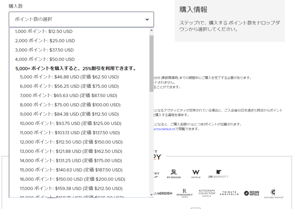 マリオットポイント(Marriott Bonvoyポイント)は以下の英語版公式サイトで購入も可能です。
