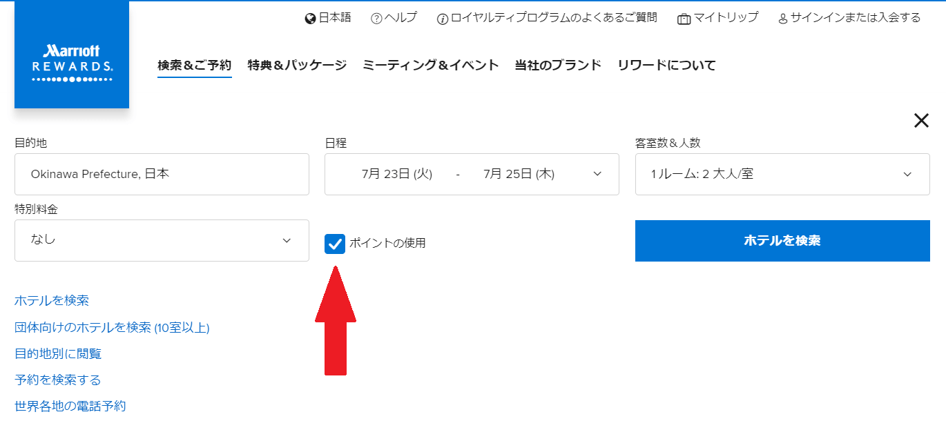 予約の方法は簡単です!公式サイトから「ポイントの使用」にチェックを入れて検索します。