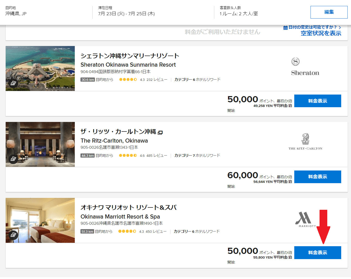 するとその日に無料宿泊ができるホテルのリストが表示されます。必要ポイントと平均宿泊料金が出てくるので、一目で1ポイント何円で使えるかを把握しながら予約できます。